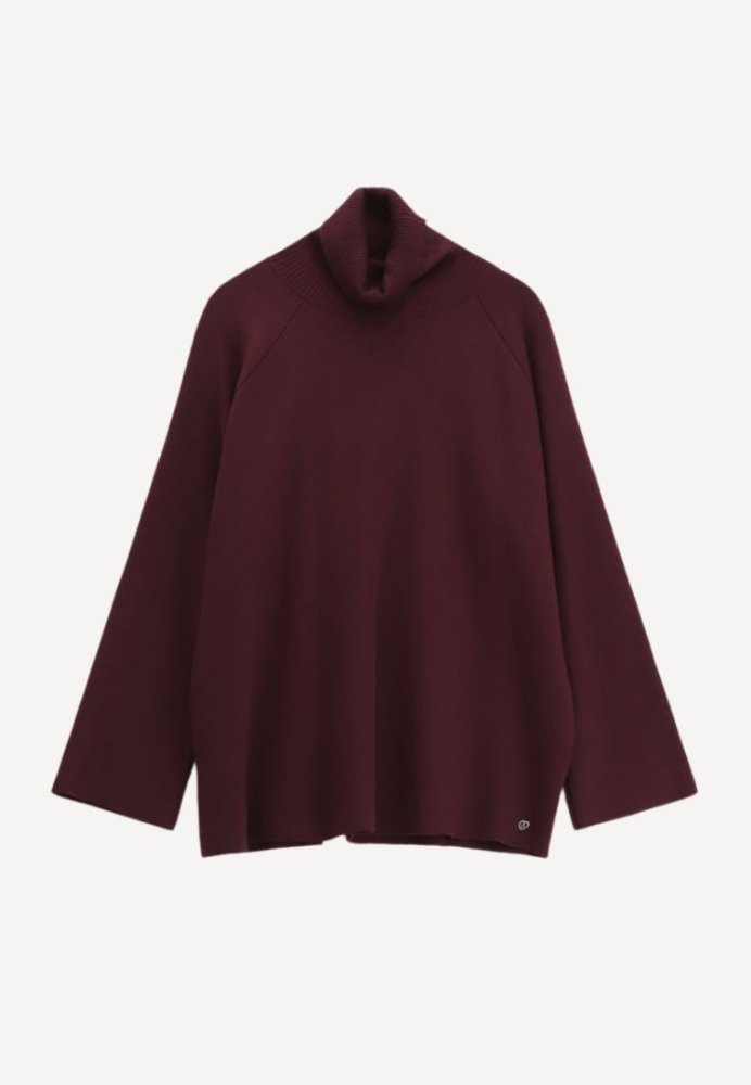 En blød og lun striktrøje i en smuk bordeaux nuance. Sweateren har et afslappet snit og et moderne udtryk, der gør den perfekt til hverdagsbrug. Kombinationen af viskose, polyester og polyamid giver en behagelig pasform og en let glans i overfladen.