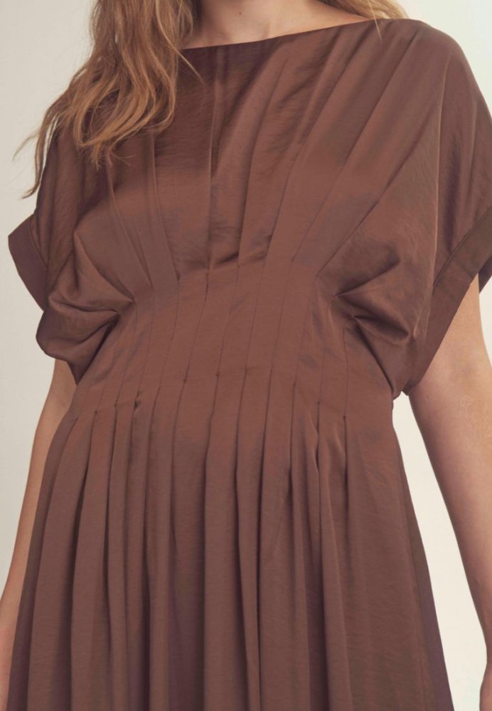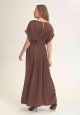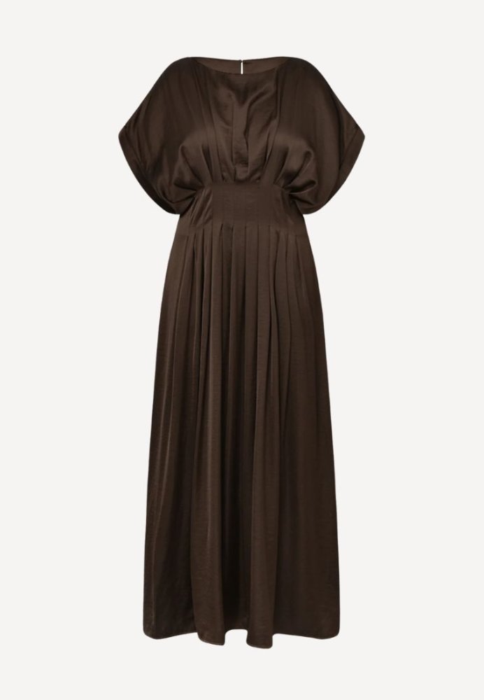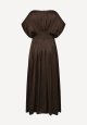 Elegant lang kjole med korsagelignende talje og sublim satinfinish, der giver et luksuriøst fald og feminin silhuet.