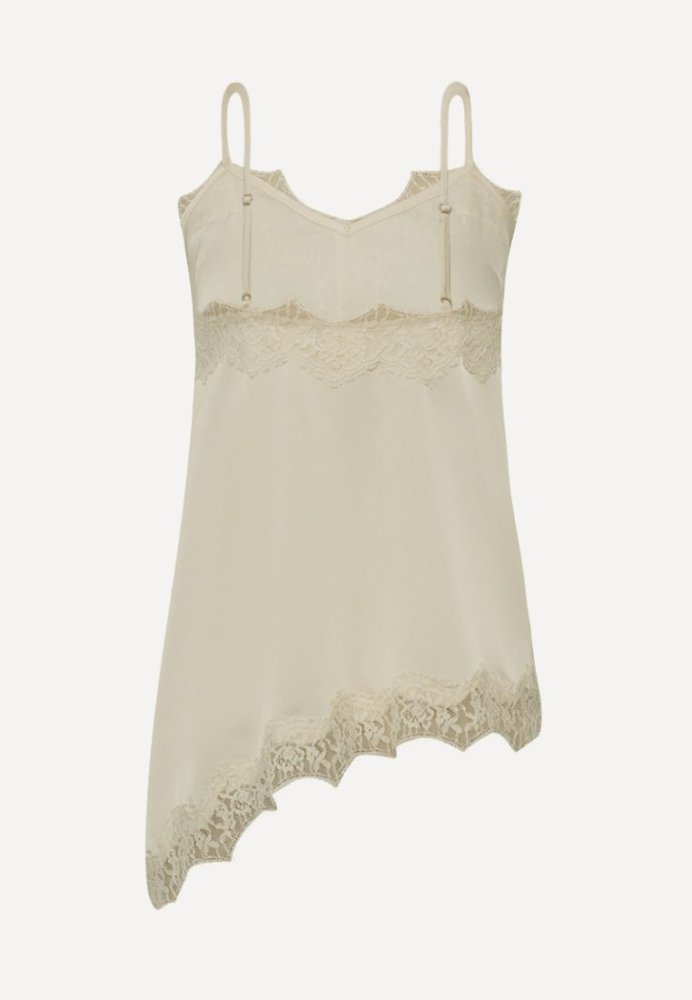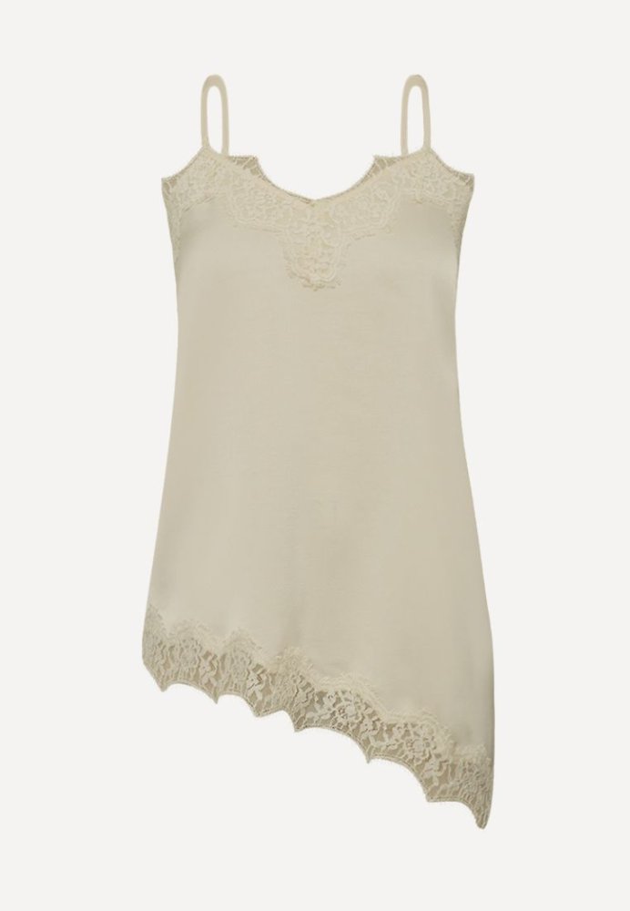 EmberGO Top fra Gossia er en eksklusiv satin-top med smukke blondedetaljer. Den kraftige polyester-satin falder elegant og føles luksuriøs mod huden. Den diagonale detalje og fine blondekant giver et feminint og sofistikeret udtryk – perfekt både til fest og hverdagsbrug under en blazer.