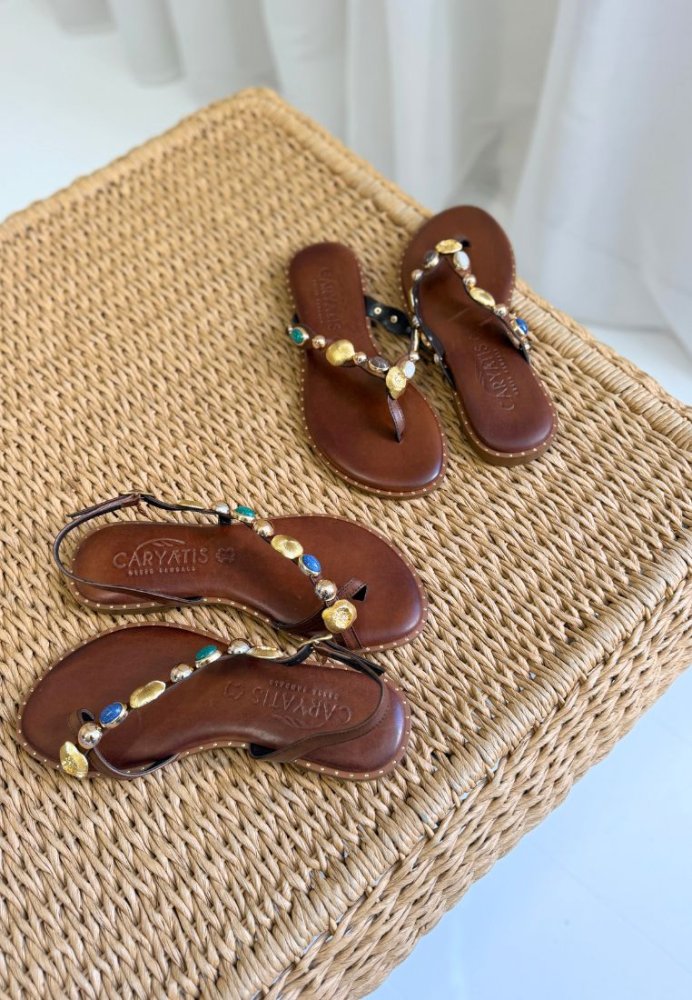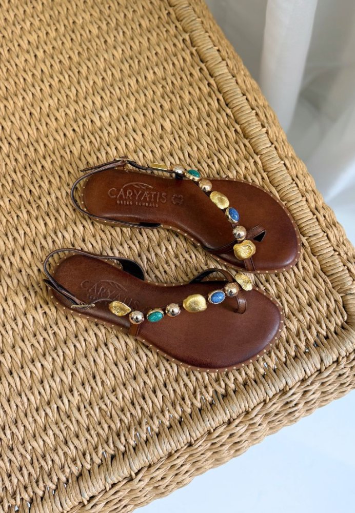 Feminin tåsplit-sandal i varmt brunt læder med dekorative elementer i forskellige farver, som giver et eksklusivt og unikt look. Den justerbare ankelrem sikrer en god pasform, mens den flade sål gør sandalen ideel til både ferie og hverdagsbrug.