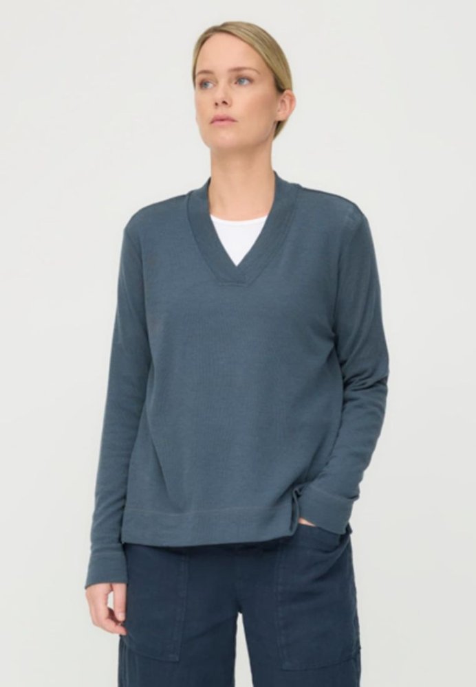 Klassisk V-hals sweater fra By Basics i 100% merinould – i farven Asphalt. Modellen har lange ærmer og en let afslappet pasform, der gør den ideel til både hverdag og arbejde. Rå, håndklippede kanter giver et unikt og moderne udtryk.