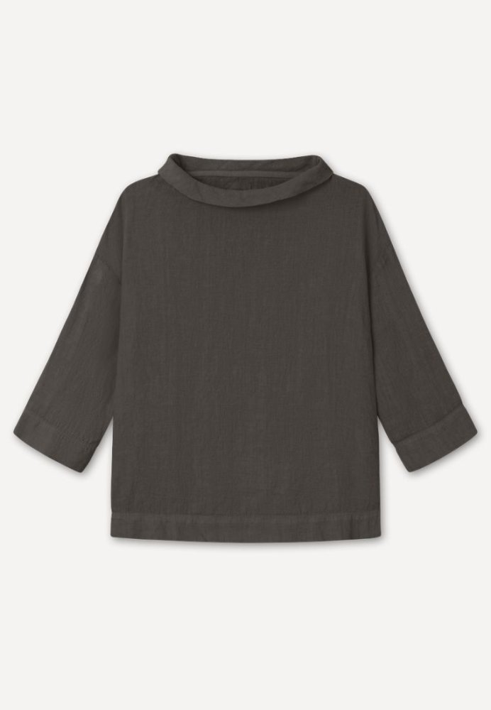 Blød og feminin bluse med et roligt og stilrent design. Den brede halsudskæring giver et elegant fald, mens de 3/4-lange ærmer tilfører et afslappet og moderne touch. Den lette kvalitet og rummelige pasform sikrer høj komfort hele dagen. Perfekt som en enkel hverdagsfavorit eller som base i et mere sofistikeret outfit.