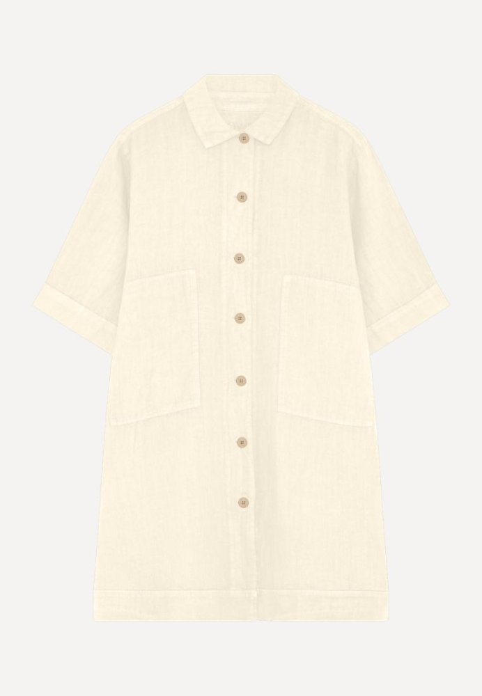 Klassisk skjortekjole med et moderne twist. Modellen har gennemgående knaplukning foran, krave og to store frontlommer, som tilfører et afslappet og funktionelt udtryk. Den lige pasform og lette kvalitet gør kjolen behagelig at have på, samtidig med at den fremstår stilren og tidløs. Perfekt til både arbejde og afslappede dage.