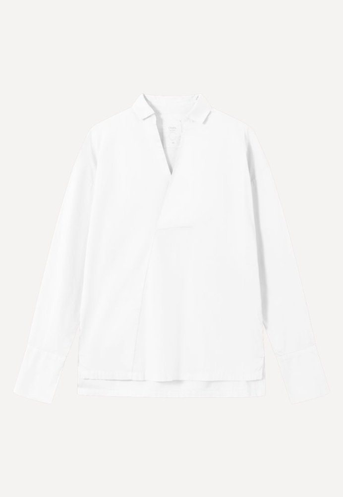 Elegant skjorte med et minimalistisk og sofistikeret udtryk. Designet er kendetegnet ved en asymmetrisk lukning foran, der giver et moderne twist til den klassiske silhuet. De lange ærmer og den lette kvalitet sikrer en behagelig pasform, mens det enkle design gør skjorten nem at kombinere med både bukser og nederdele. En stilren tilføjelse til enhver garderobe.