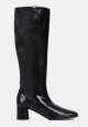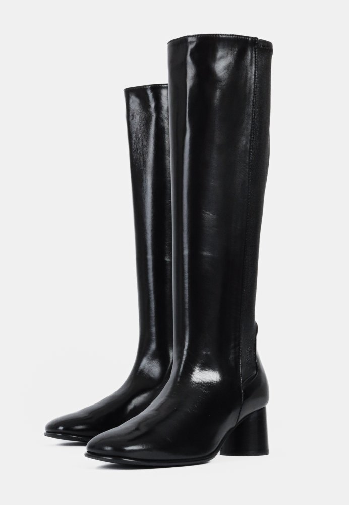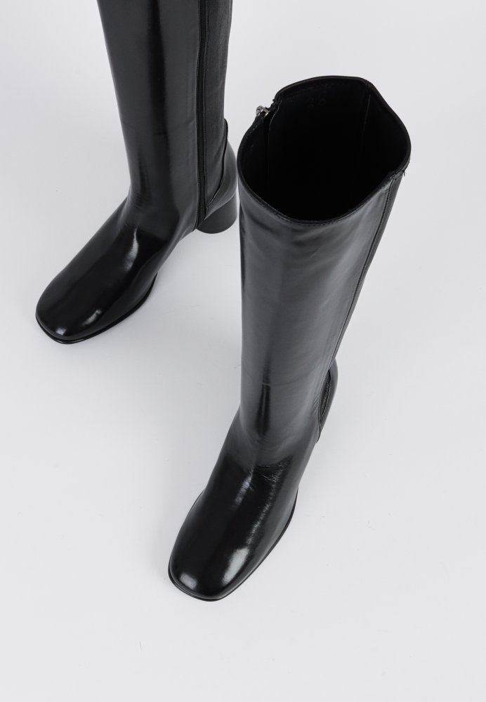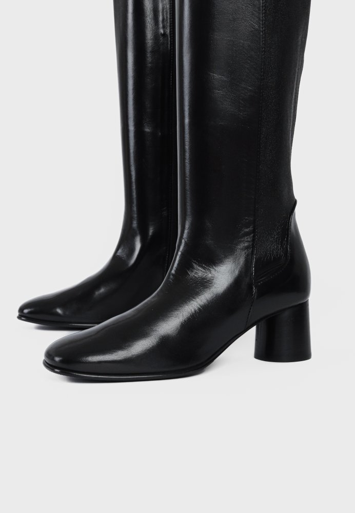 Lang italiensk støvle med hæl i en elegant sort nuance. Støvlen er et stilfuldt valg til enhver garderobe. Støvlen er lavet af kvalitetslæder og har en slank silhuet, der når op til midt på læggen, hvilket skaber et feminint og raffineret udtryk. Den spidse snude tilføjer et klassisk touch, mens hæler sikrer både komfort og stabilitet. Med sin glatte sorte overflade og tidløse design kan denne støvle nemt styles til både hverdag og fest.