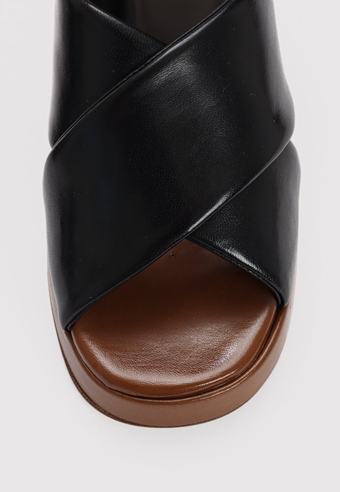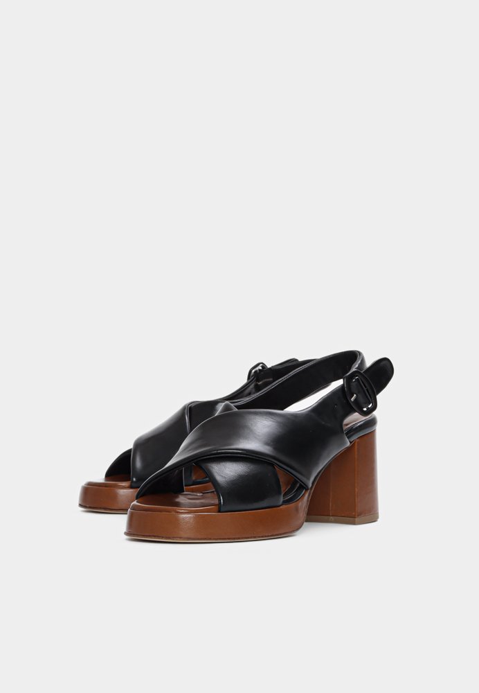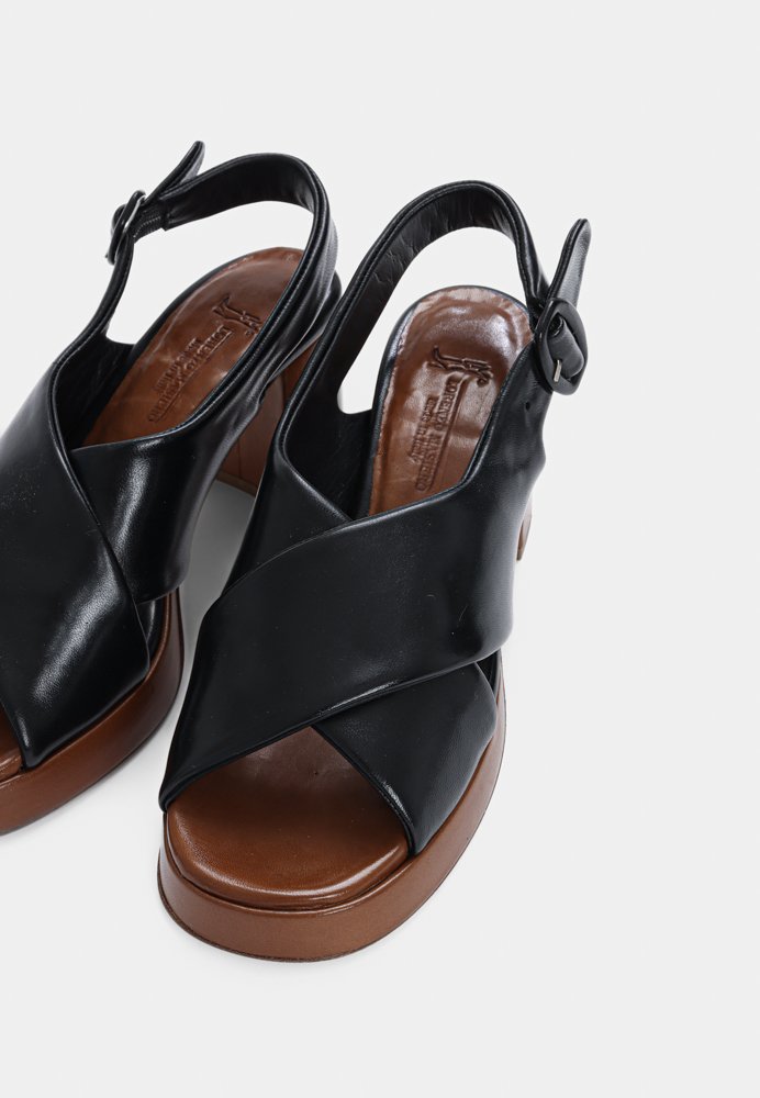 Feminin plateau-sandal med krydsede remme og markant hæl, der skaber et elegant statement. Den løftede silhuet giver både højde og stabilitet, mens det rene design gør modellen alsidig og nem at bruge til både festlige anledninger og stilfulde hverdagslooks.