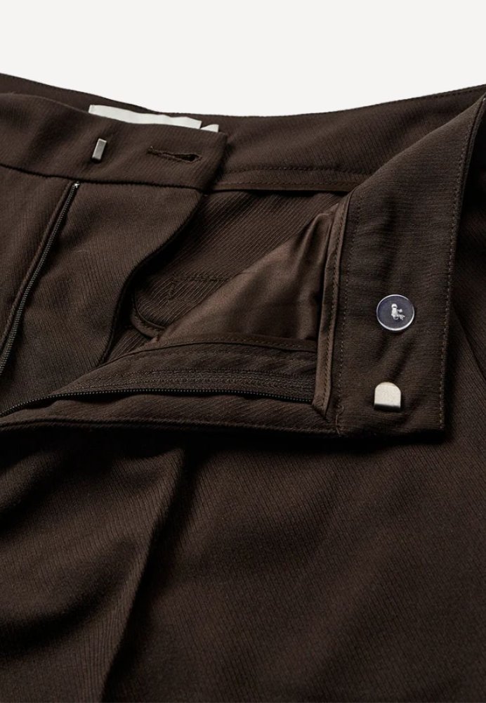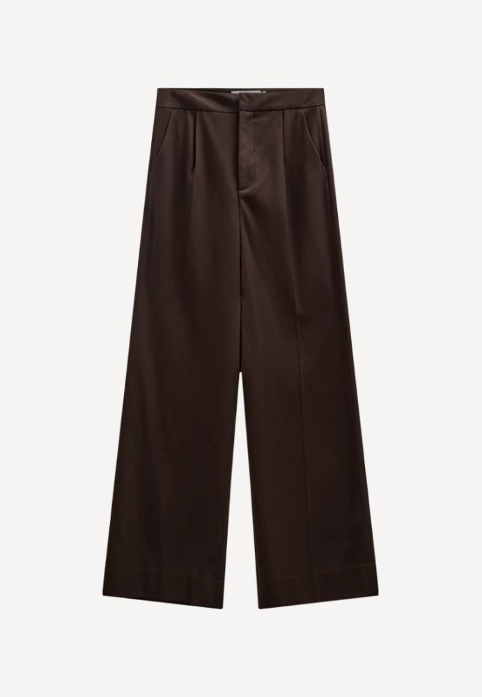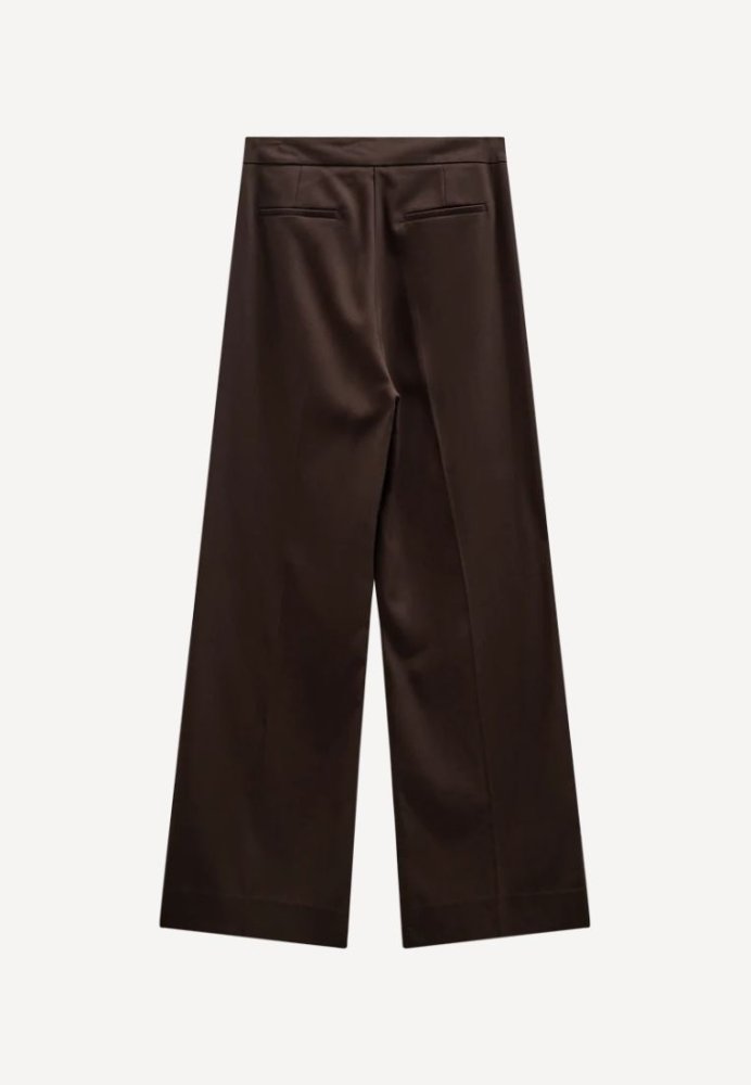 Elegant buks med høj talje og løs vidde i benene – mole/mørkebrun farve og dæmpet luksuskvalitet med pressefolder og sidelommer.