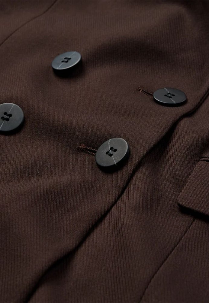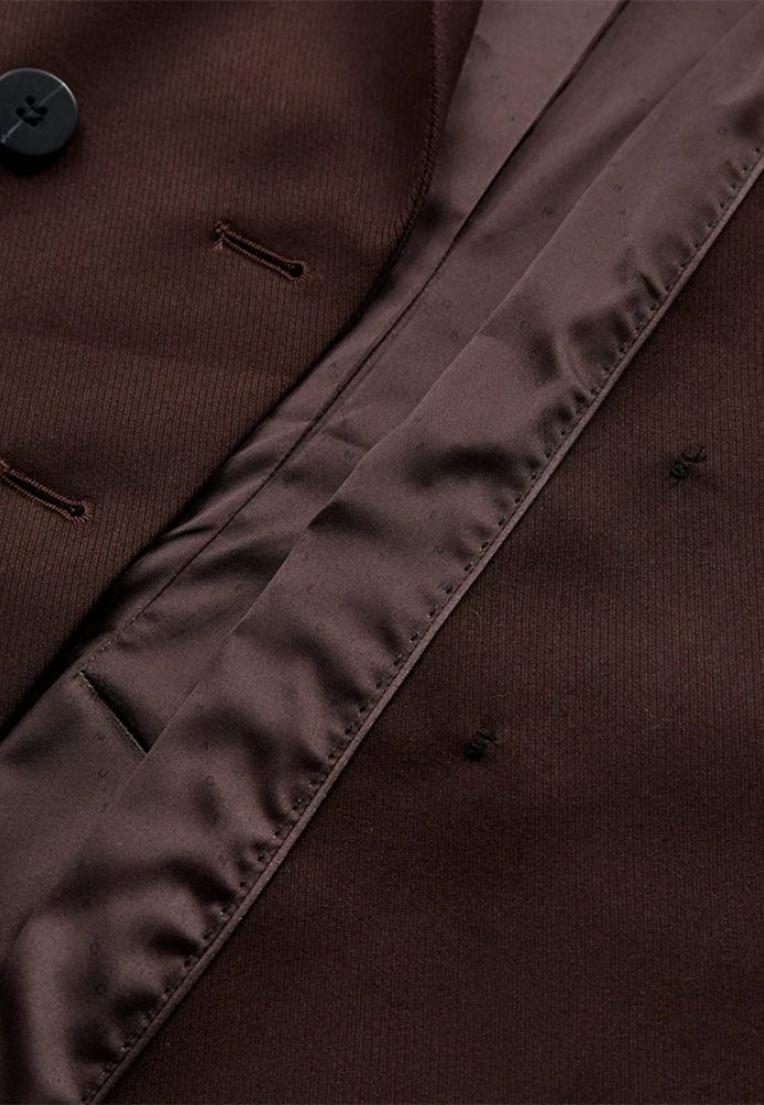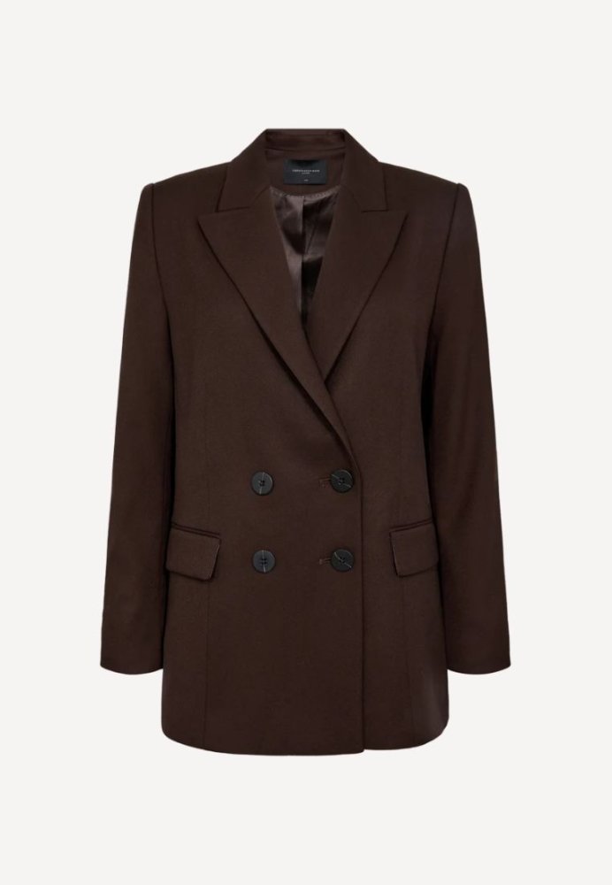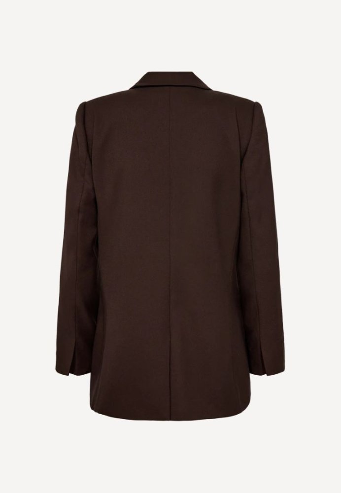 Elegant blazer i brun fra Cph Muse med logomønstret foer, brede skuldre og V-udskæring med revers – taljefokus og stilfuld finish.