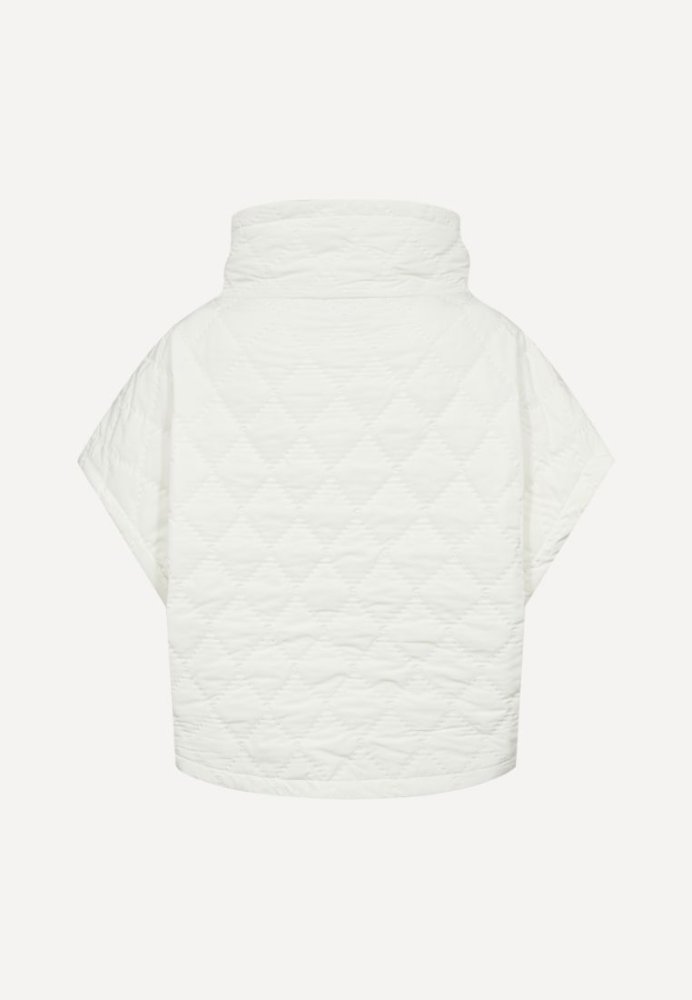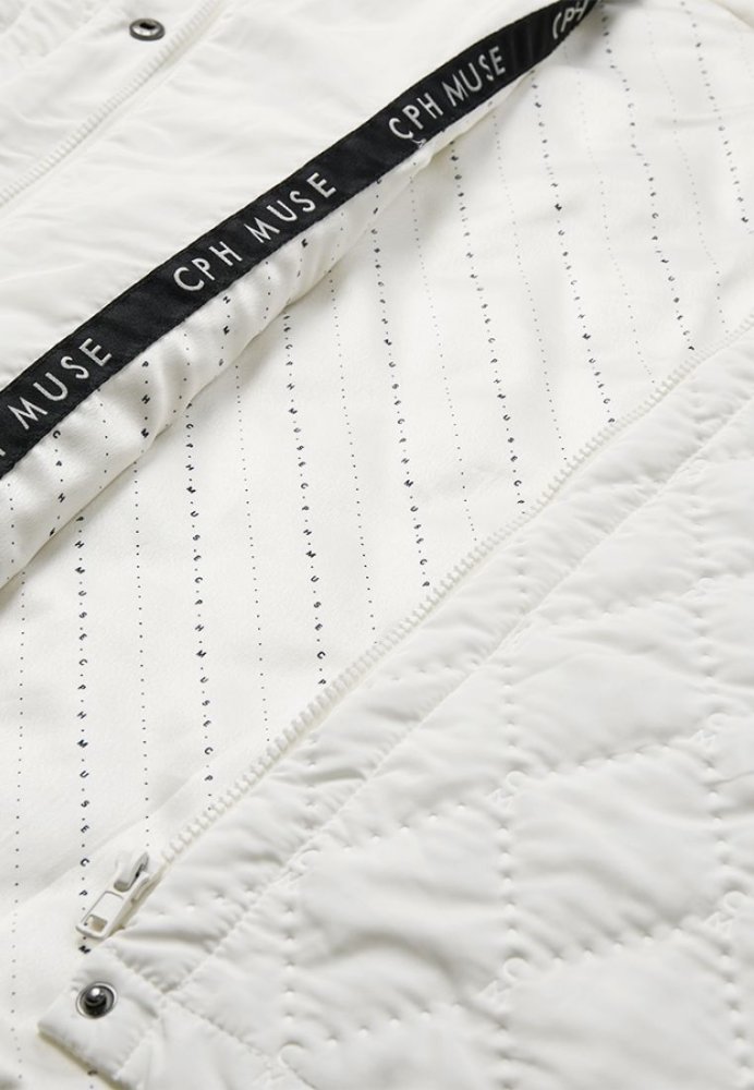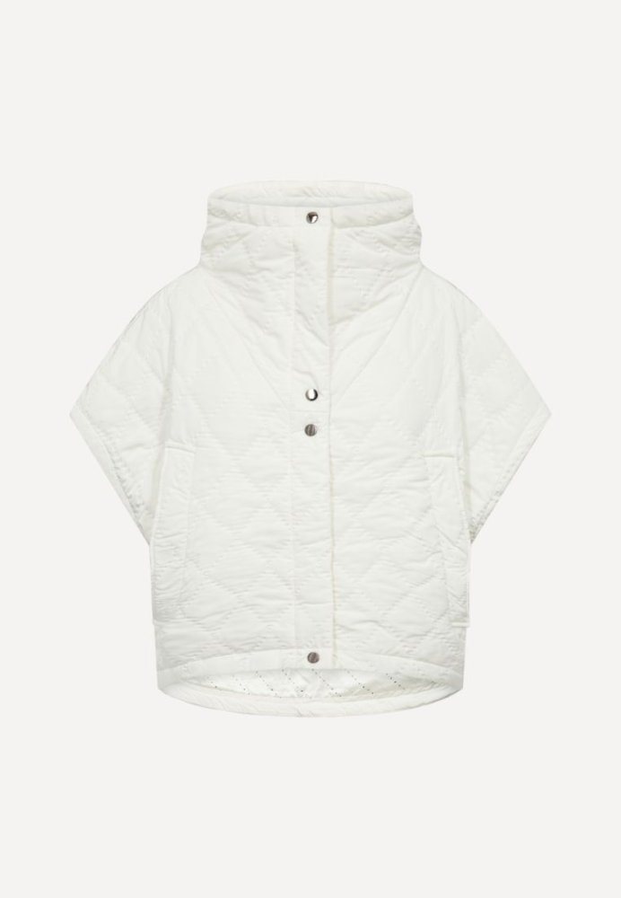 CMNET Cape er en let vatteret kappe i en mat, vævet polyester med et moderne og funktionelt udtryk. Den boxy silhuet med brede skuldre og høj, vatteret krave giver et markant look, mens det varmefikserede quiltmønster med monogram tilfører et eksklusivt touch. Skjulte trykknapper og lynlås under stolpen sikrer et rent design, og de diskrete frontlommer understreger kappens praktiske detaljer. Den afrundede bund og lynlåse i sidesømmene giver ekstra bevægelsesfrihed og fleksibilitet.