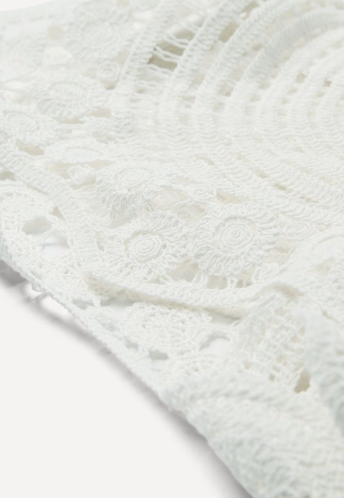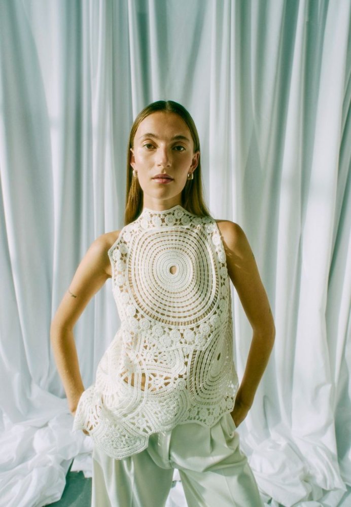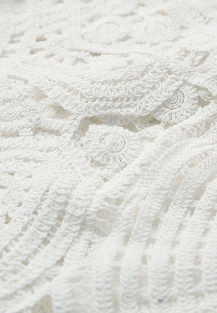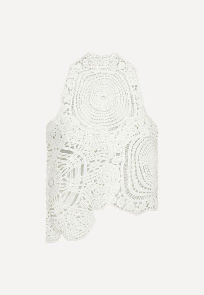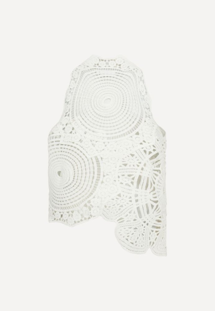 En iøjnefaldende top med et kunstnerisk og feminint udtryk. De smukke, håndinspirerede blonde- og broderidetaljer danner et unikt mønster, der giver toppen dybde og karakter. Den høje hals og ærmeløse silhuet skaber en elegant balance mellem det moderne og det romantiske.Toppen har en let og luftig kvalitet, der gør den behagelig at have på, samtidig med at den tilfører et eksklusivt touch til ethvert outfit. Style den med enkle bukser eller en nederdel for at lade detaljerne træde frem - perfekt til både særlige anledninger og stilfulde hverdagslooks.