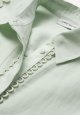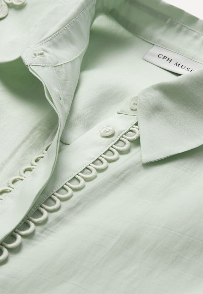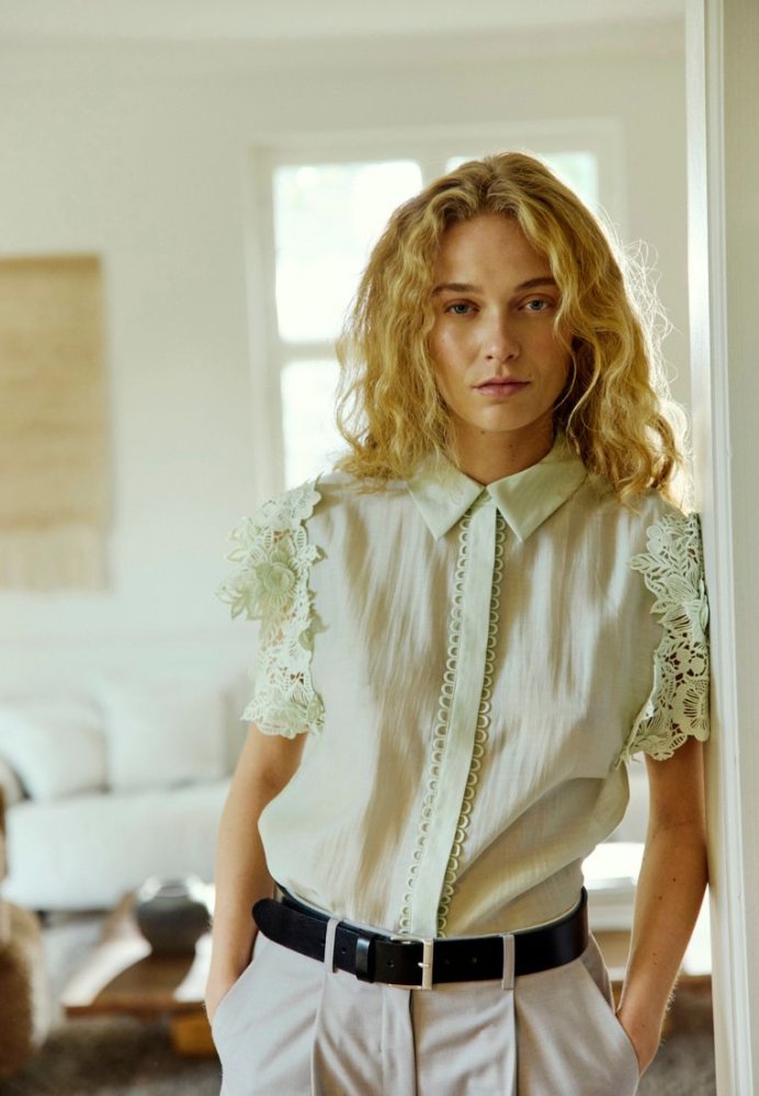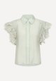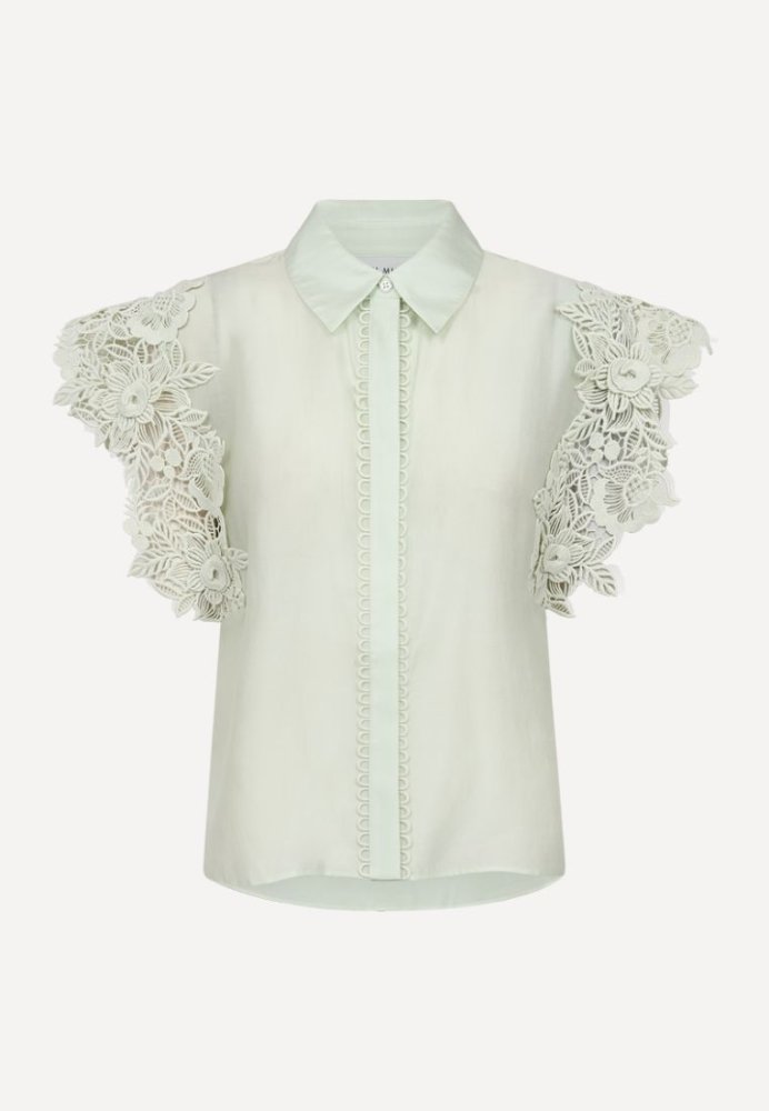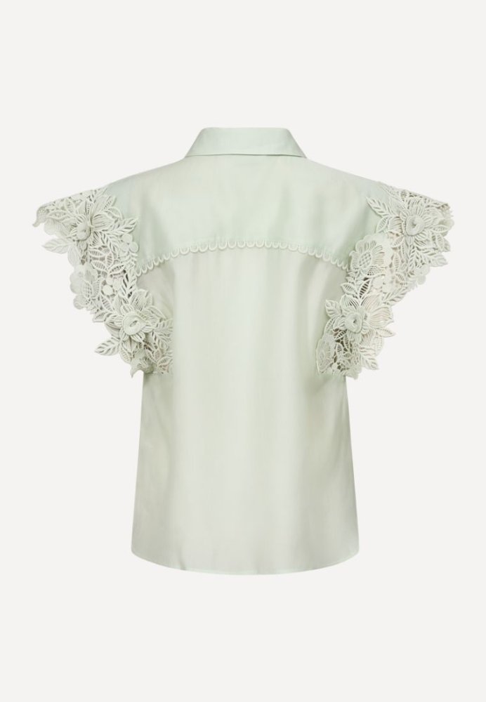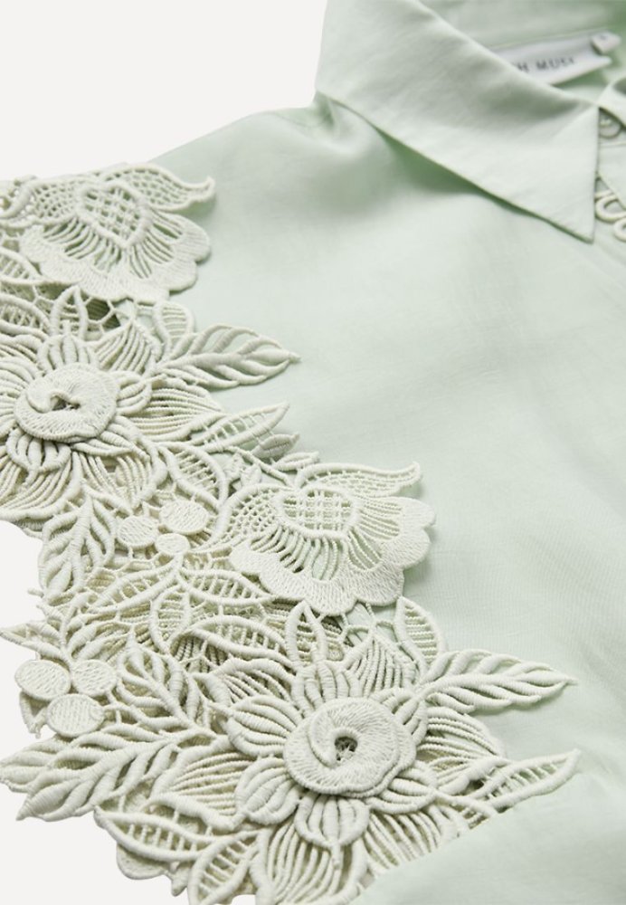 En feminin skjorte i en luksuriøs kvalitet, designet med skjult knaplukning og delikate broderede kanter. De korte ærmer prydes af et diskret blomsterinspireret mønster, der giver et let og elegant look. Perfekt til både hverdag og mere pyntede anledninger.