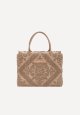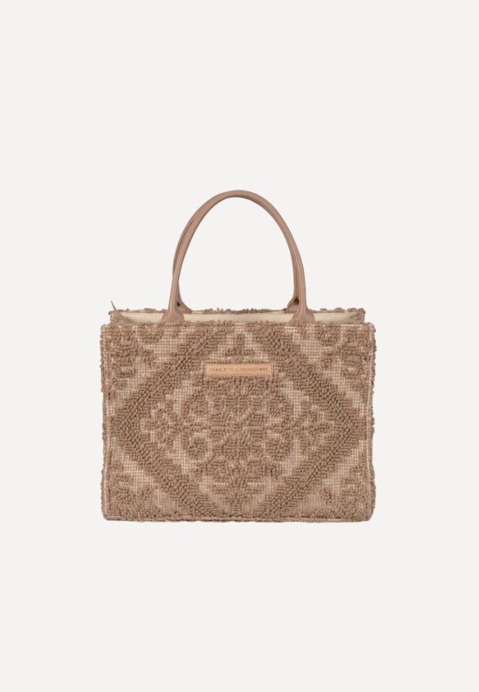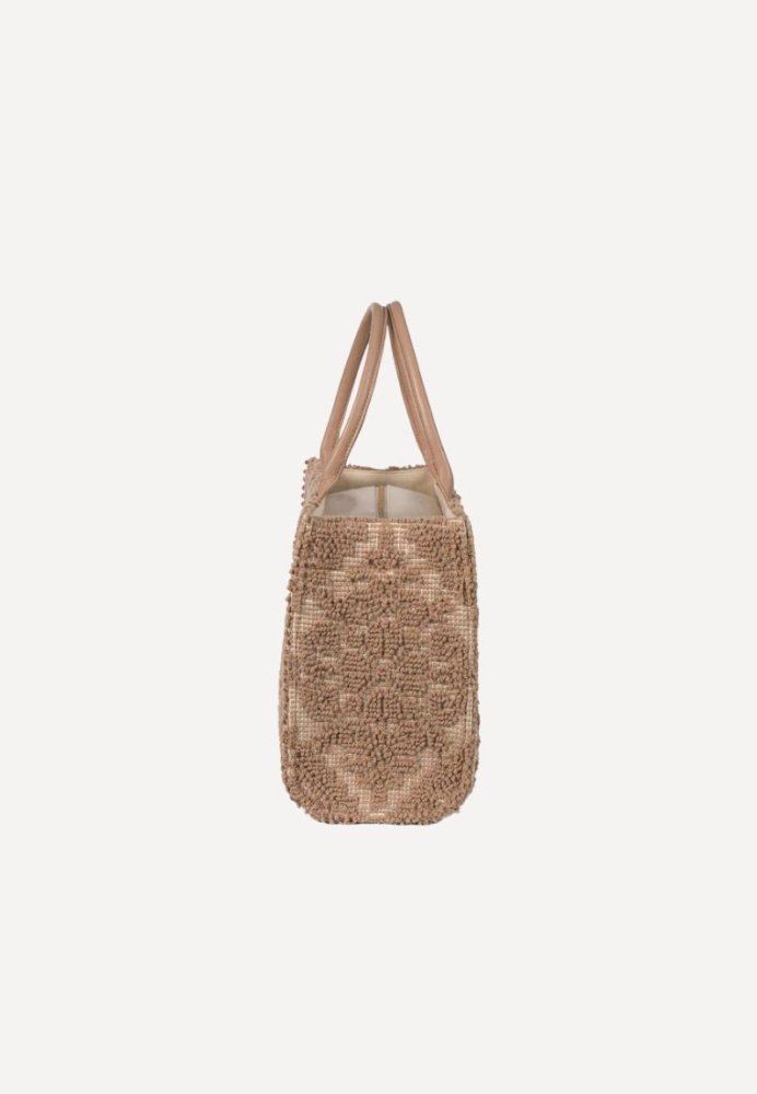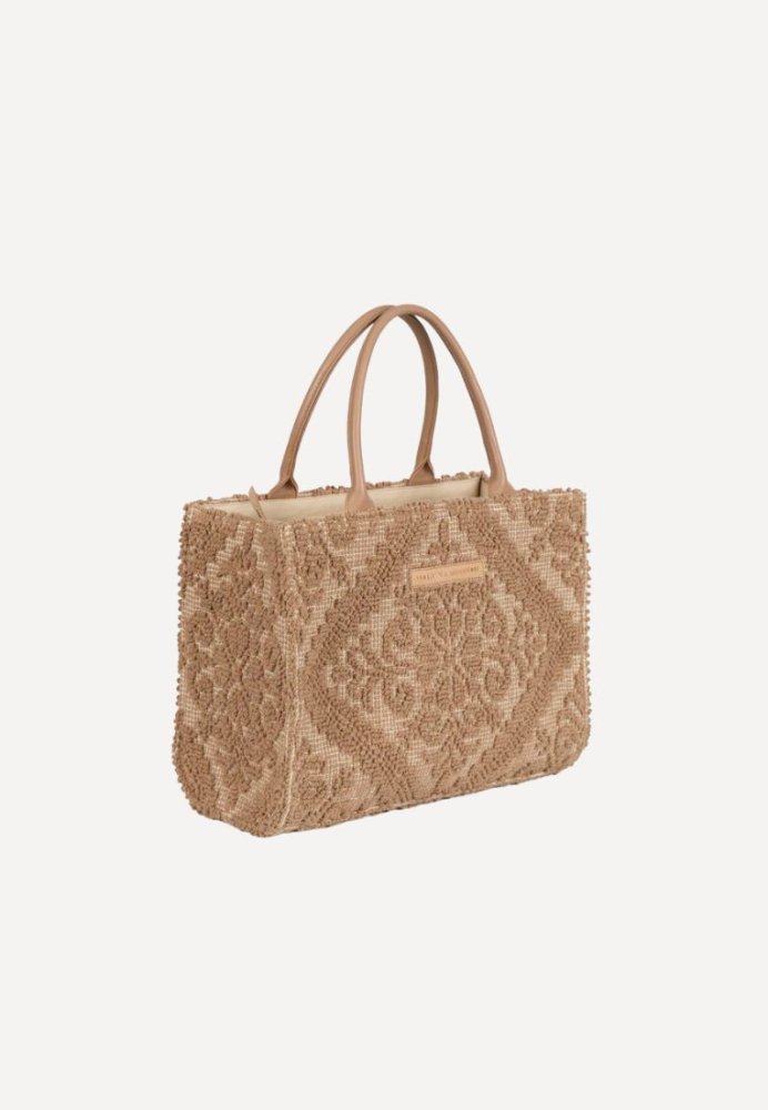 En elegant og sommerlig tote bag i en smuk tekstureret kvalitet med fine mønstrede detaljer. Tasken kombinerer et afslappet, naturligt udtryk med stilrene læderhanke, der giver et eksklusivt touch.Den rummelige størrelse gør den ideel til både hverdagsbrug, shopping eller strandture, hvor du har brug for plads til alle dine essentials. Det lette design og de bløde materialer gør den behagelig at bære, mens det dekorative mønster tilfører personlighed og karakter til dit look.
