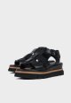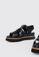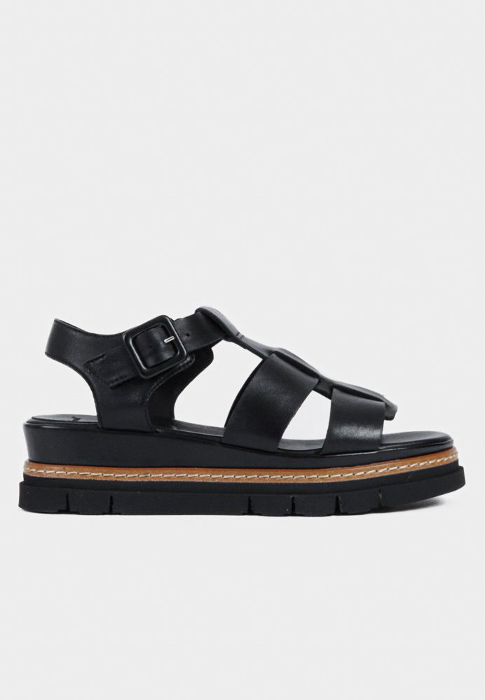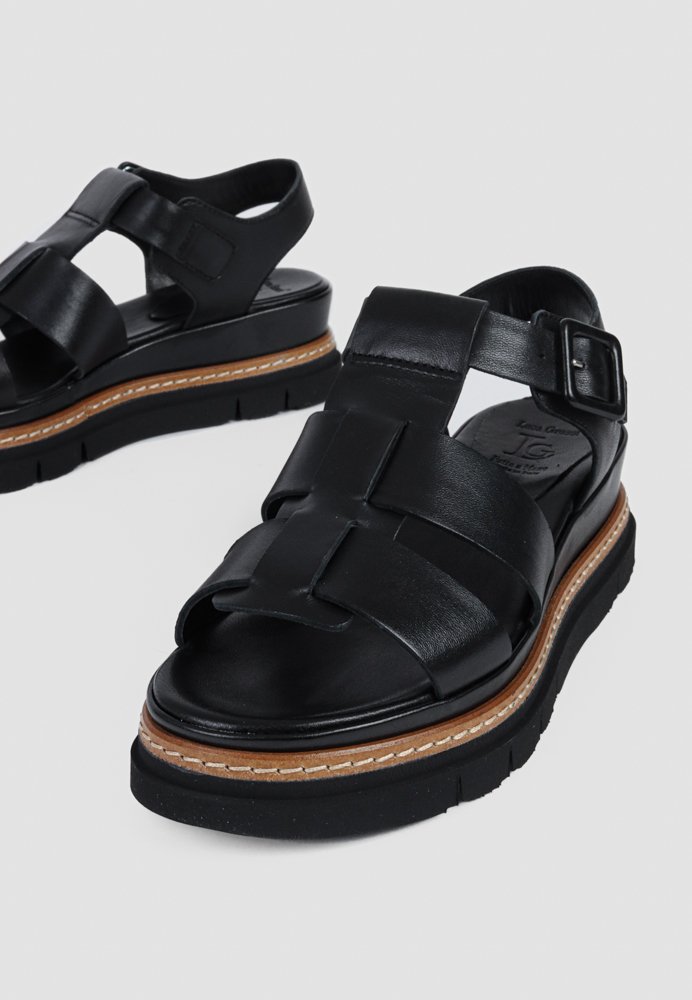 Klassisk sort lædersandal med brede remme og stabil platformssål, der kombinerer god støtte med et moderne og afslappet udtryk. Den enkle silhuet gør sandalen alsidig og let at style til både casual hverdagslooks og mere elegante outfits. Et tidløst valg til garderoben, hvor komfort og stil går hånd i hånd.