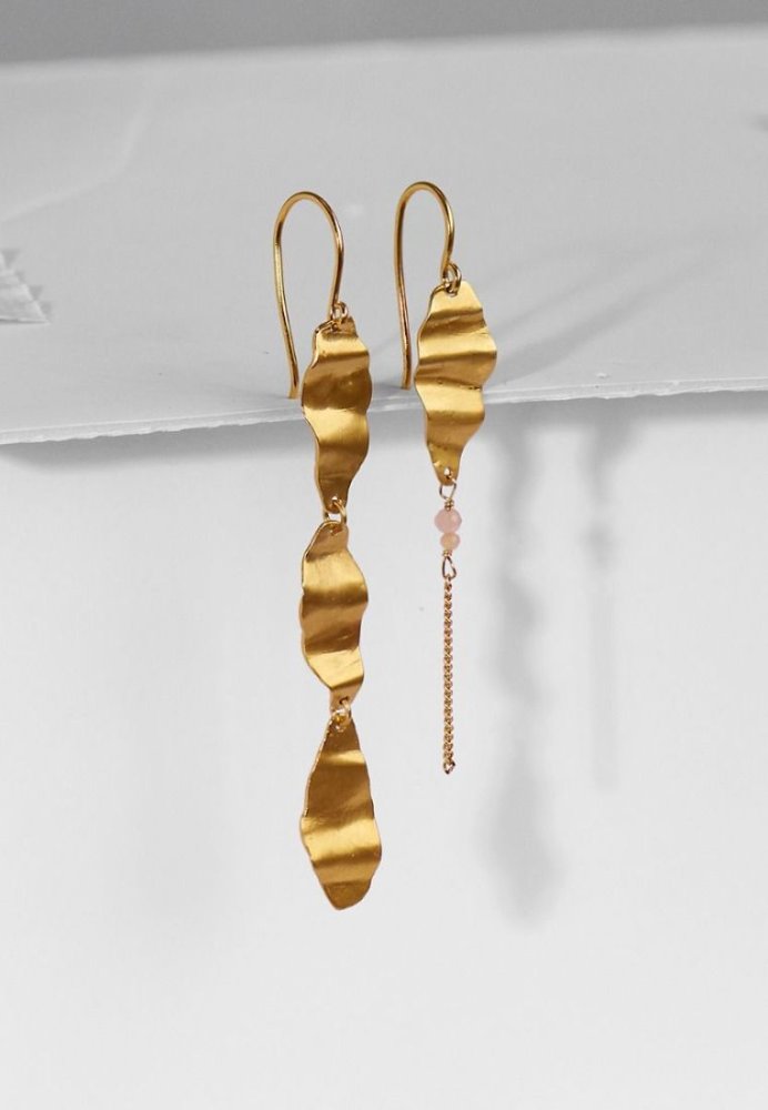Ørering med hamret oval plade og kæde i 18 k forgyldt sølv med rose moonstone – boho-lækker og alsidig til både hverdag og fest.