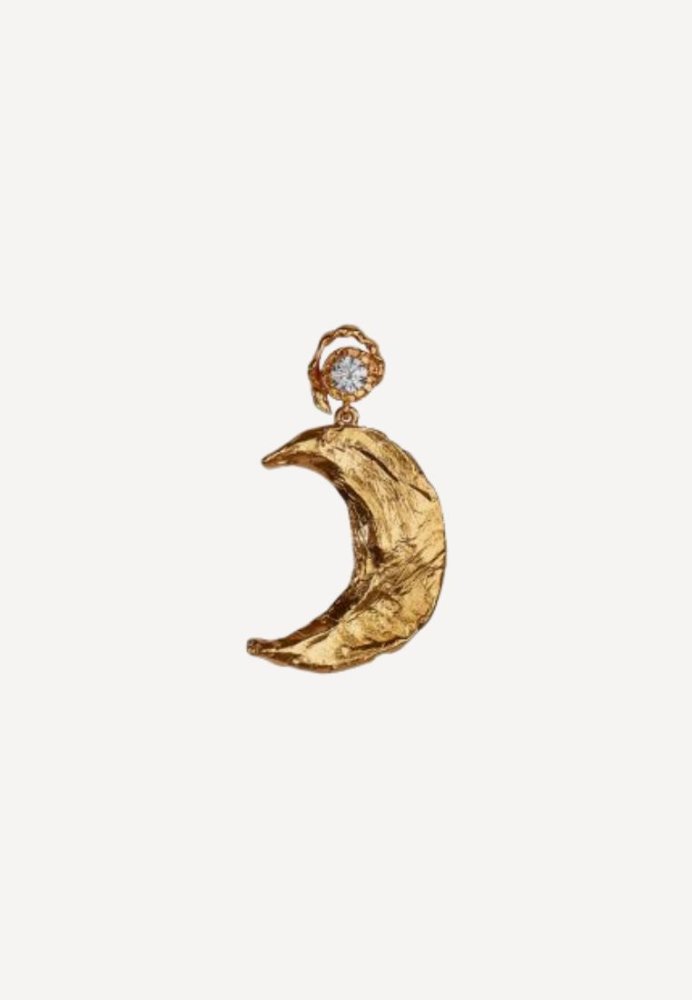 Stor statement ørering i forgyldt sterlingsølv. Øreringen har en stor ørestik med ædelsten, hvor under der hænger en stor, flot måne i et levende og dansende look. Øreringens look er banket og råt, hvilket giver et levende spil i lyset, når den danser fra øret. Denne ørering kan nemt bæres som et matchende par, eller mixes med andre øreringe for et personligt look.
