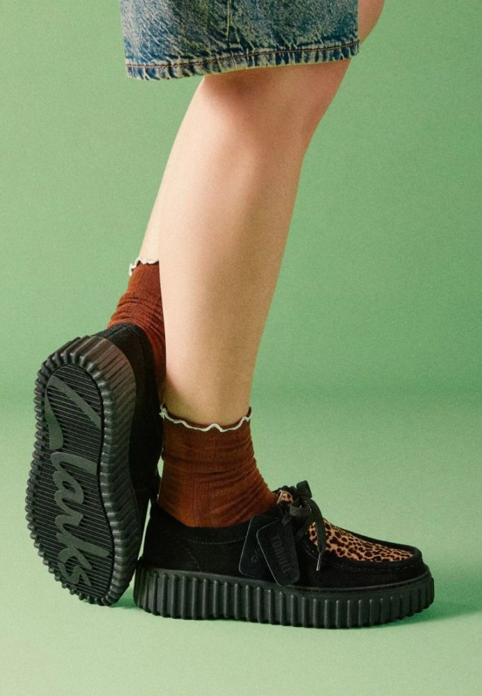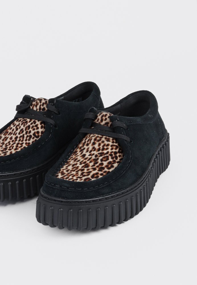 Torhill Bee er en opdatering af Clarks' ikoniske Wallabee™-design, lavet i premium ruskind med et moderne leopardprint. Skoene har justerbare snørebånd, en komfortabel, formstøbt læderfodbed og en holdbar TPR-ydersål med EVA-fyld. Den let hævede hæl giver et subtilt løft, mens de præget vedhæng hylder Clarks' arv.