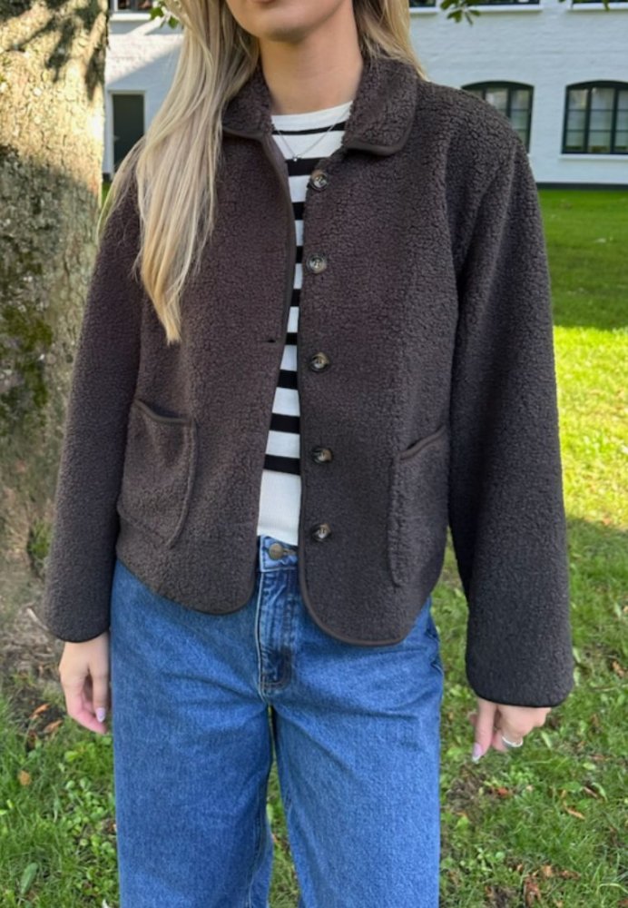 Malou Teddy Jacket er en blød og vamset jakke i brun teddyfleece, der kombinerer komfort med et afslappet, moderne udtryk. Jakken er fremstillet i 100% polyester, hvilket gør den både let og varm. Den perfekte efterårsjakke, som kan styles både casual til jeans og sneakers eller mere feminint over en kjole. En hyggelig must-have til de kolde dage.