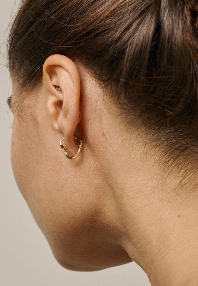Heart Hoops Small er et par elegante og fine øreringe formet som et hjerte. Hjertet er markant uden at virke tungt, og designet er enkelt, men stadig unikt. Den smukt håndlavede overflade giver øreringene et eksklusivt udtryk. Forfra er de diskrete og stilfulde, men set fra siden træder den smukke hjerteform tydeligt frem. Heart Hoops Small er den perfekte gave til en, du holder af.