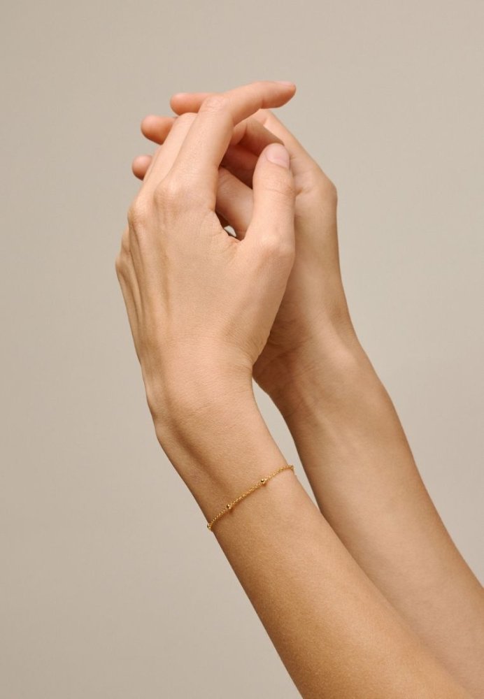 Beaded Chain Bracelet fra ENAMEL Copenhagen er et enkelt og feminint armbånd med små, jævnt fordelte guldkugler langs en fin kæde. Det minimalistiske design gør armbåndet smukt alene, men også ideelt til et lag-på-lag look sammen med andre smykker. De små kugler tilfører et diskret spil og en elegant rytme, som giver et stilrent og tidløst udtryk.