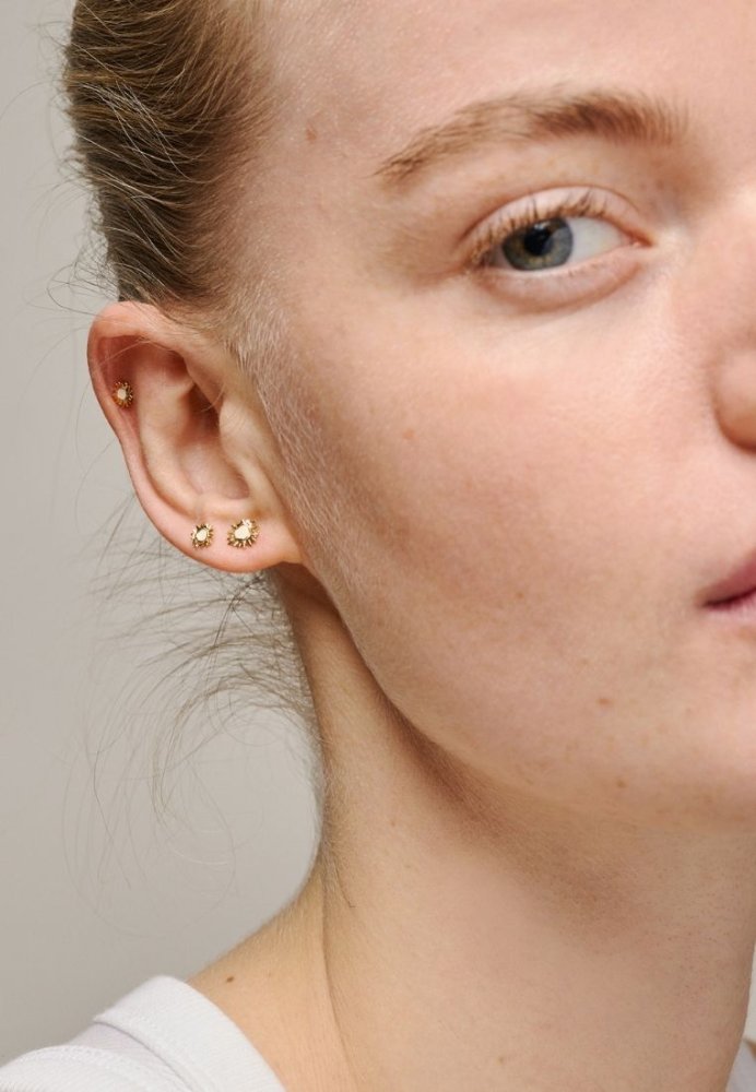 Mini Sunshine Studs fra ENAMEL Copenhagen er små, detaljerige ørestikker med et fint motiv, der kan tolkes som enten en sol eller en solsikke. Det klassiske, men legende design giver et feminint og elegant udtryk, som fungerer perfekt til både hverdag og særlige lejligheder. Den lille størrelse gør dem ideelle til et diskret look eller som del af en personlig ear stack.