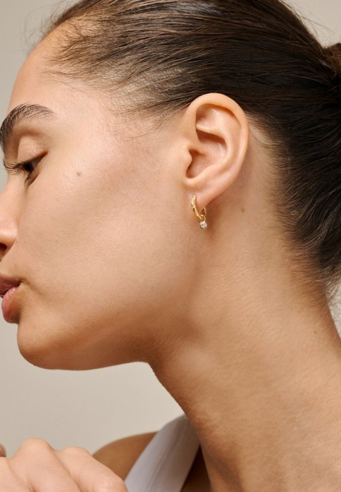 Belle CZ Hoops fra ENAMEL Copenhagen har et festligt og eksklusivt udtryk med en rå guldfarvet kugle og en funklende CZ-sten i centrum. Kombinationen af det klassiske hoop-design og de elegante detaljer giver et stilrent look, der passer både til hverdag og fest. Brug dem alene for et elegant udtryk eller kombiner med andre øreringe for en mere personlig styling.