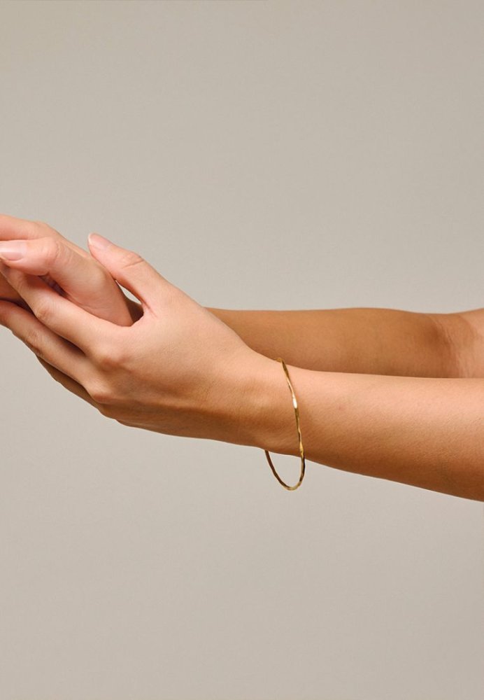 Organic Arena armbåndet har et råt og organisk udtryk med en smukt hamret overflade, der skaber et levende spil i lyset. Det ultratynde design giver et let og elegant look, som nærmest svæver på håndleddet og tilfører en diskret, eksklusiv følelse. Armbåndet er enkelt, men raffineret, og kan bæres alene for et minimalistisk udtryk eller styles sammen med flere armbånd for et mere personligt og farverigt look. Fremstillet i 925 sterling sølv, som naturligt former sig let efter håndleddet, hvilket giver en behagelig og individuel pasform. Et tidløst smykke, der tilfører stilfuld elegance til enhver garderobe.