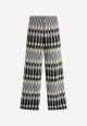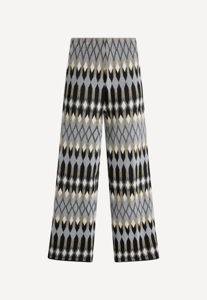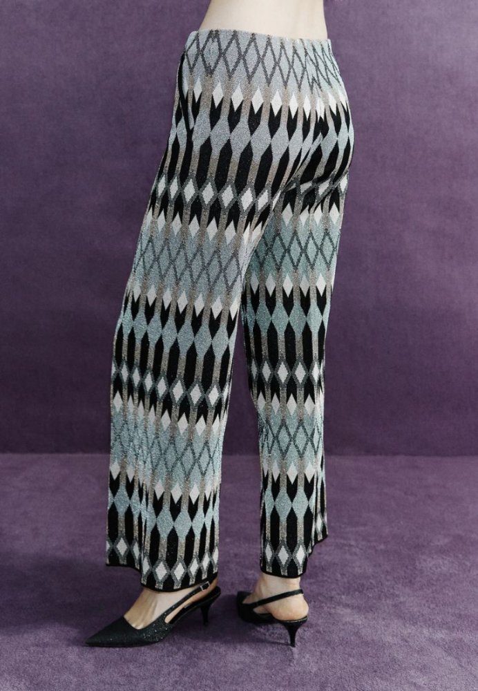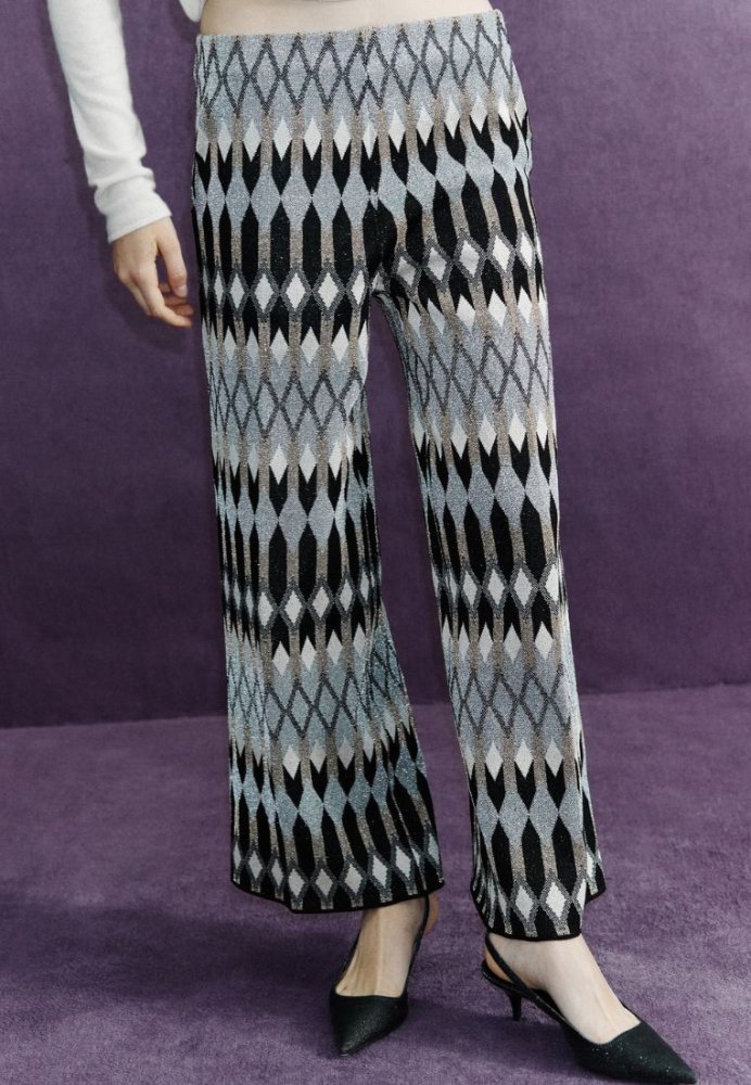 Elegant cropped buks i et smukt geometrisk lamé-jacquard mønster. Modellen har mid waist og elastisk linning, hvilket giver både komfort og et sofistikeret udtryk. Perfekte bukser til særlige lejligheder, hvor du ønsker at kombinere stil med behagelig pasform.