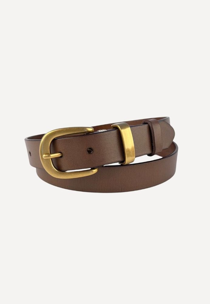 Akanel bælte i Light Brown er et klassisk og tidløst bælte i glat skind med et elegant, afrundet spænde i gylden messing. Den varme lysebrune nuance gør bæltet alsidigt og nemt at style til både jeans, habitbukser og kjoler. Et enkelt og stilrent design, der tilfører et eksklusivt touch til dit outfit.