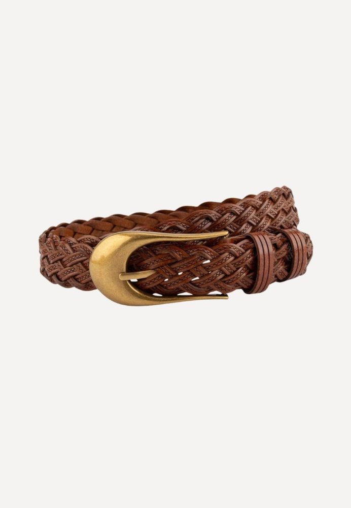 Akanel bælte i cognac er et klassisk og tidløst bælte i glat skind med et elegant, afrundet spænde i gylden messing. Den varme lysebrune nuance gør bæltet alsidigt og nemt at style til både jeans, habitbukser og kjoler. Et enkelt og stilrent design, der tilfører et eksklusivt touch til dit outfit.