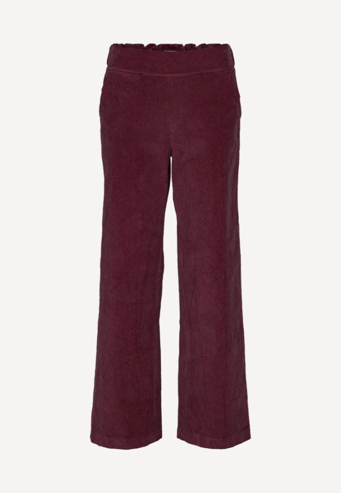 VICTORIA CORDUROY bukser i bordeaux fra AW25-kollektionen. Bukserne er lavet i blød og slidstærk kordfløjl med en behagelig pasform i størrelse XS. Materialet består af 97% bomuld og 3% elastan, som sikrer god komfort og fleksibilitet.