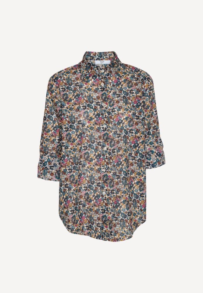 ERICA Shirt i Blue Flower er en smuk skjorte med et feminint blomsterprint. Skjorten er lavet i 100% bomuld, hvilket giver en let og behagelig kvalitet, der føles skøn mod huden. Den kan både styles til hverdag med jeans eller til fest med en nederdel og heels.