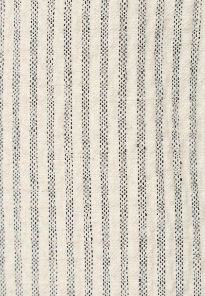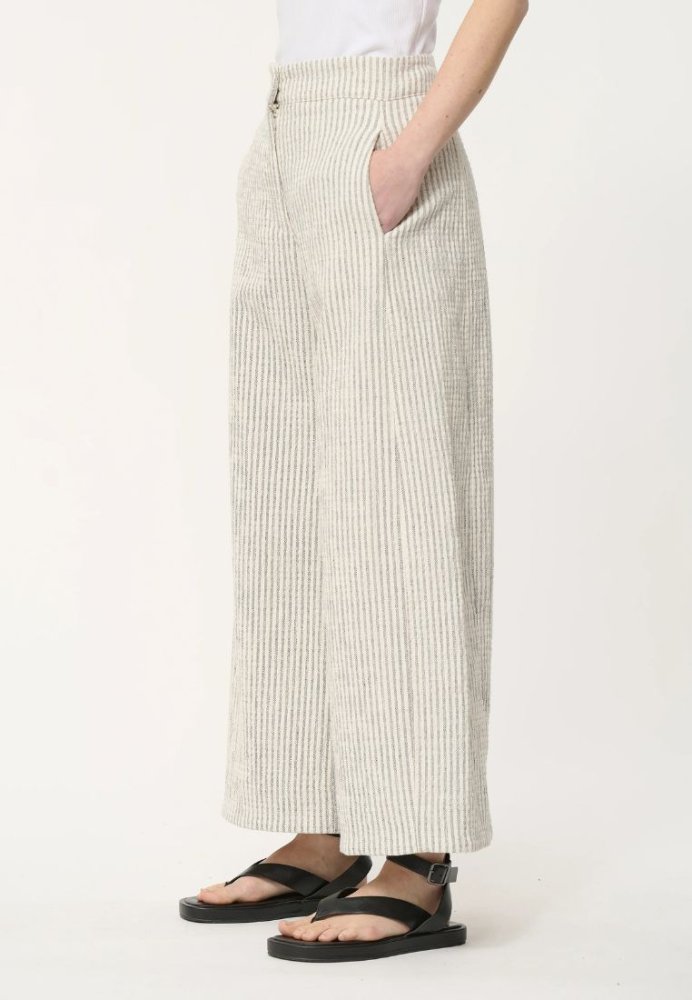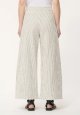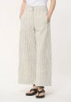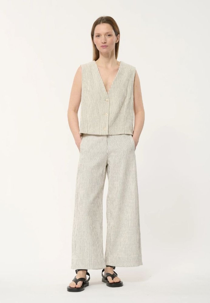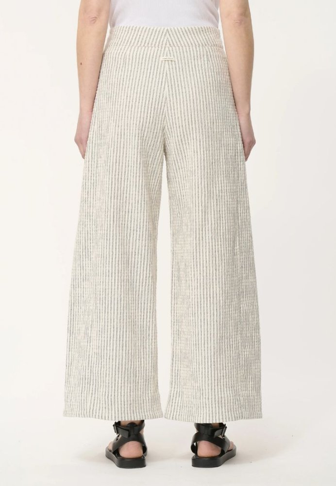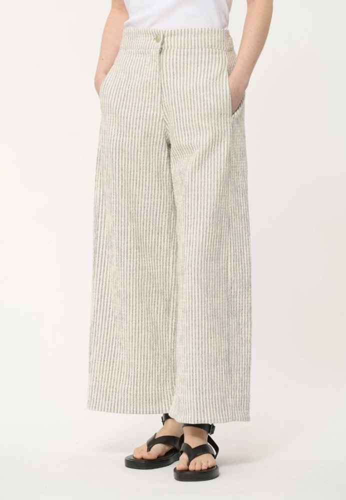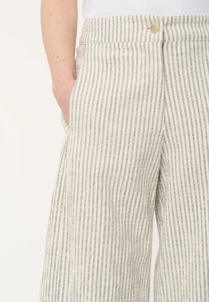 Disse brede bukser har et præget stribemønster og en let afrundet pasform. De er designet med høj talje, monteret bælte med stropper, og lukkes med en knap og lynlås. Bukserne har også usynlige lommer i sidesømmene, hvilket giver et elegant og strømlinet udseende.