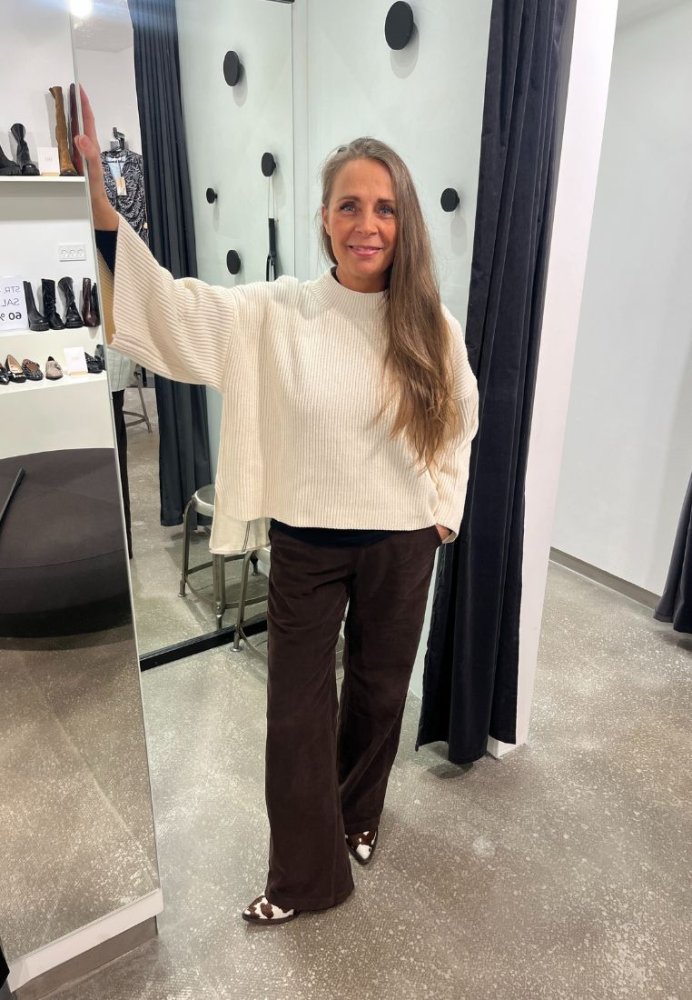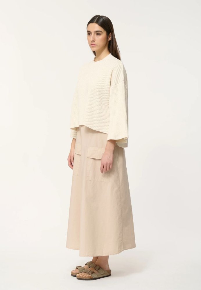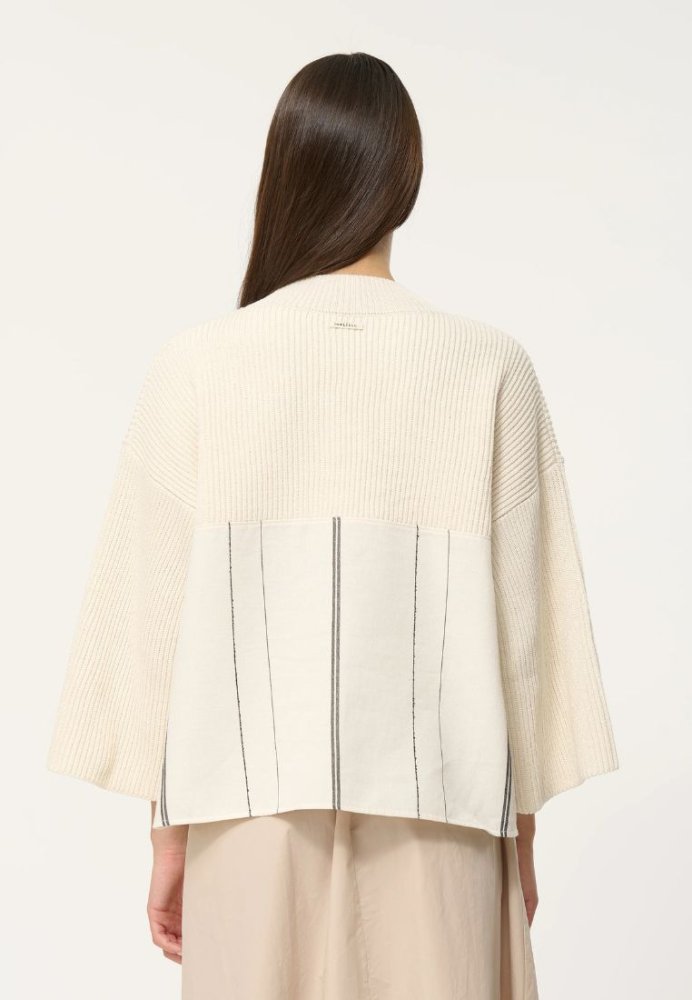 Denne løstsiddende trøje i økologisk bomuld har en rund halsudskæring, brede 7/8-ærmer og dropped armholes, hvilket giver et afslappet og moderne look. Trøjen har desuden slidser i siderne og et bagstykke i stribet bomuld, der tilføjer et subtilt designelement.