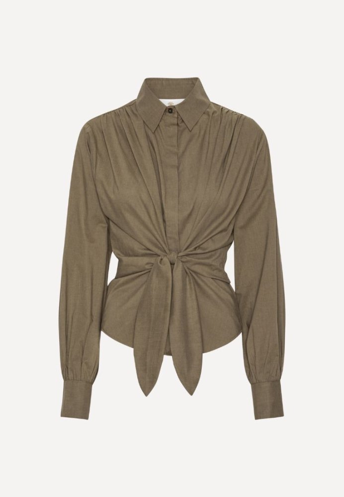 Stilren khakifarvet skjorte med bindeknude foran. Designet i blødt stof med flot fald, der giver et feminint og moderne udtryk – ideel til både arbejde og afslappede dage.