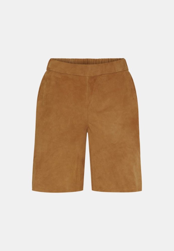 Brune ruskindsshorts, der kombinerer komfort og stil. De har en længere benlængde, elastik i taljen for en fleksibel pasform, skrå sidelommer og en elegant saddleback-detalje. Den rå kant forneden giver et afslappet og moderne udtryk. Perfekte med strømpebukser om vinteren eller bare ben om sommeren – et alsidigt valg til både chikke og afslappede looks. Da ruskind er et naturligt materiale, kan der forekomme små variationer i farven. For at bevare kvaliteten anbefales det at imprægnere dem med en plejespray til ruskind inden brug og vedligeholde dem regelmæssigt.