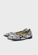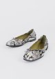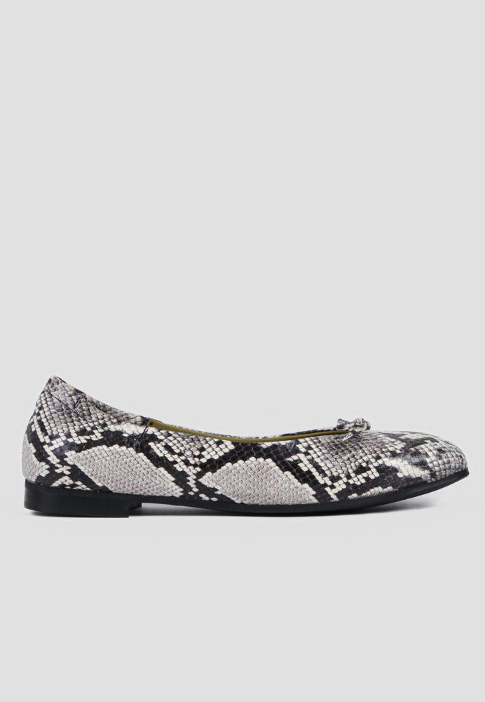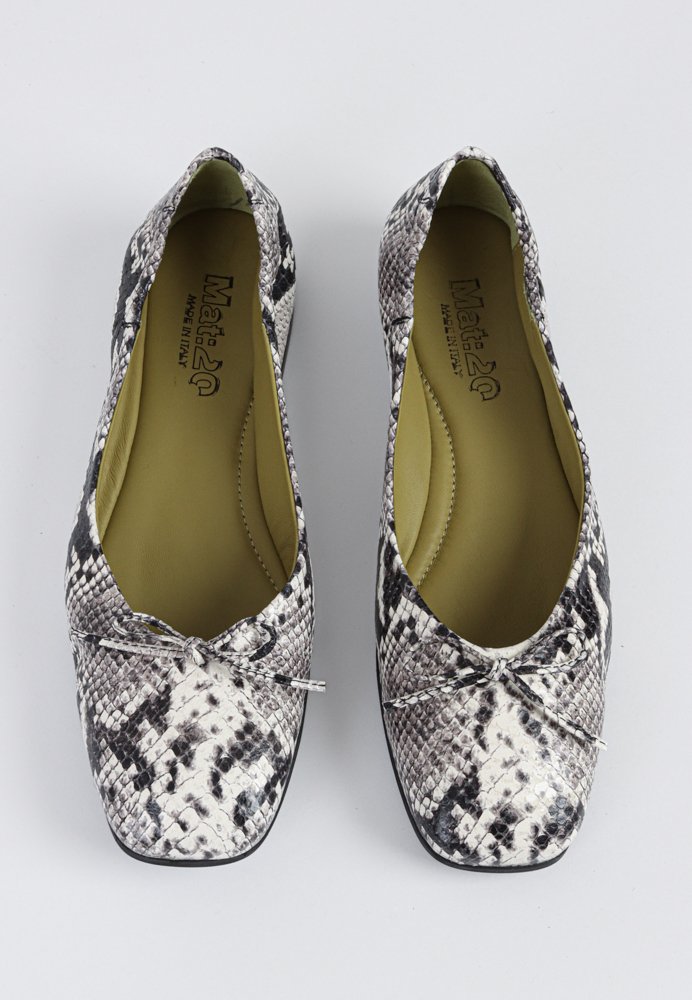 Denne stilfulde ballerina fra MAT20 kombinerer klassisk elegance med et moderne twist. Fremstillet i blødt skind med et eksklusivt slangeskindsprint, tilbyder skoen både komfort og et sofistikeret udtryk. Den let firkantede snude giver et trendy look, mens den fine sløjfe ved spidsen tilfører et feminint touch. Med en diskret hæl på 1,5 cm får du et let løft uden at gå på kompromis med komforten. Perfekt til både hverdagsbrug og mere formelle anledninger – en tidløs ballerina, der løfter ethvert outfit!