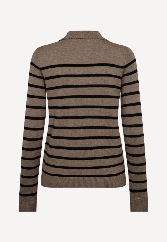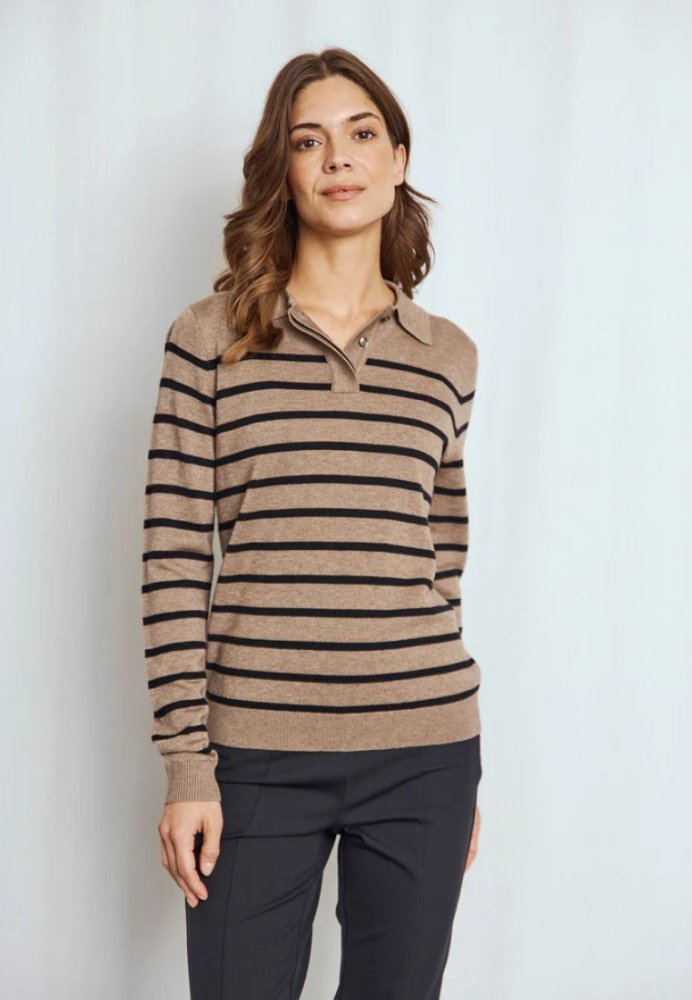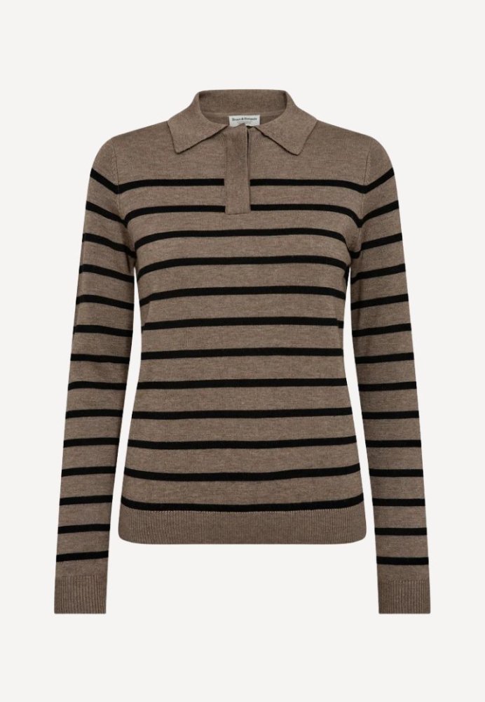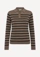 Elegant polotrøje i brun-sort stribet design – med skjult lukning i kraven og tidløs herreinspireret stil.