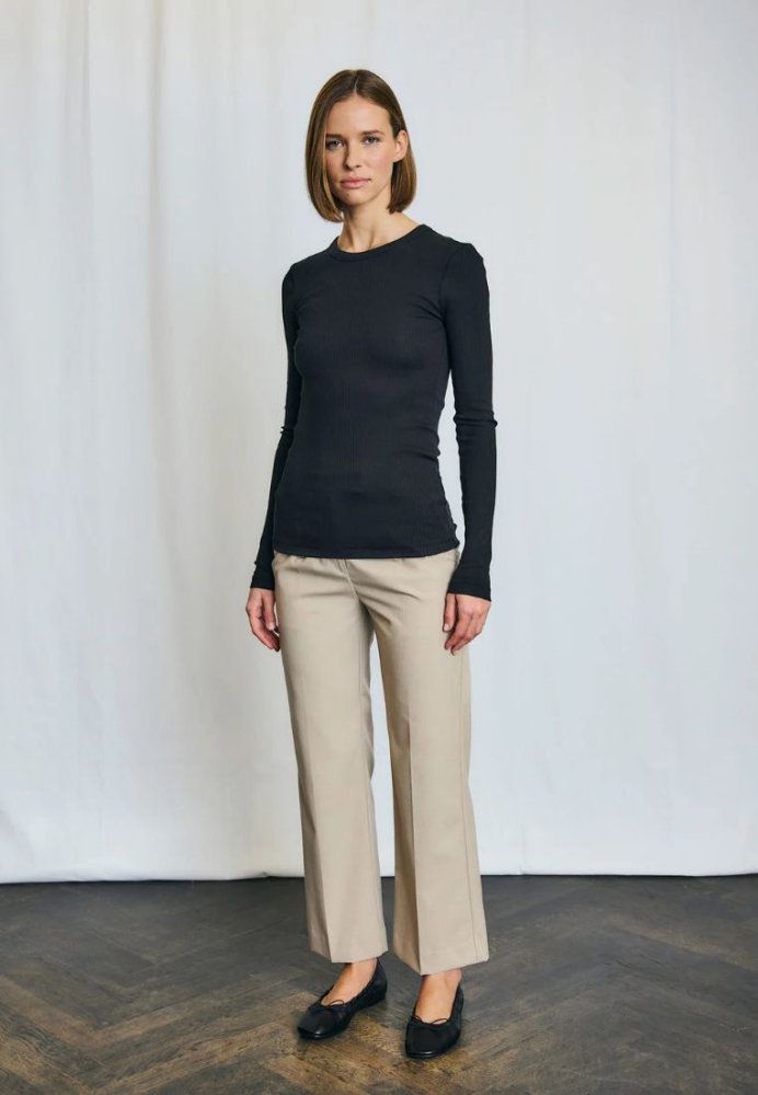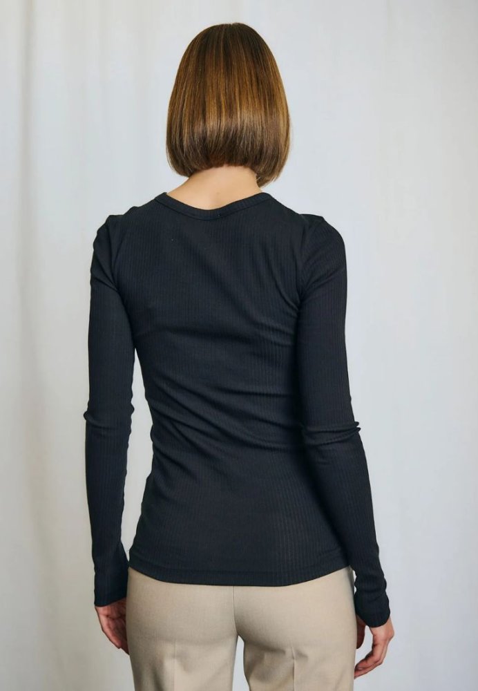 Margrethe er en langærmet top med regular fit, der kombinerer komfort og enkel elegance. Toppen er lavet af en blød og behagelig kvalitet med 98% bomuld og 2% elastan, som sikrer en fleksibel pasform og god bevægelsesfrihed. Den sorte farve gør den let at kombinere med både hverdagens og festens outfits.