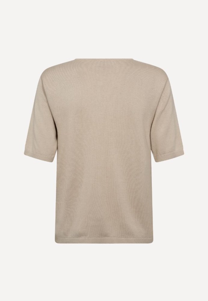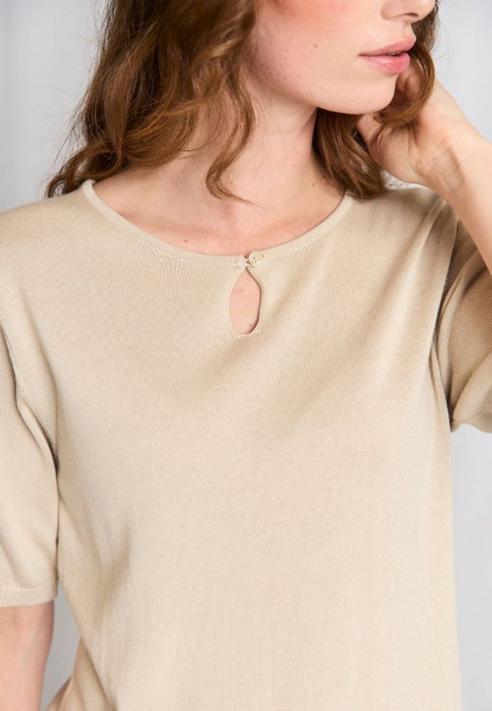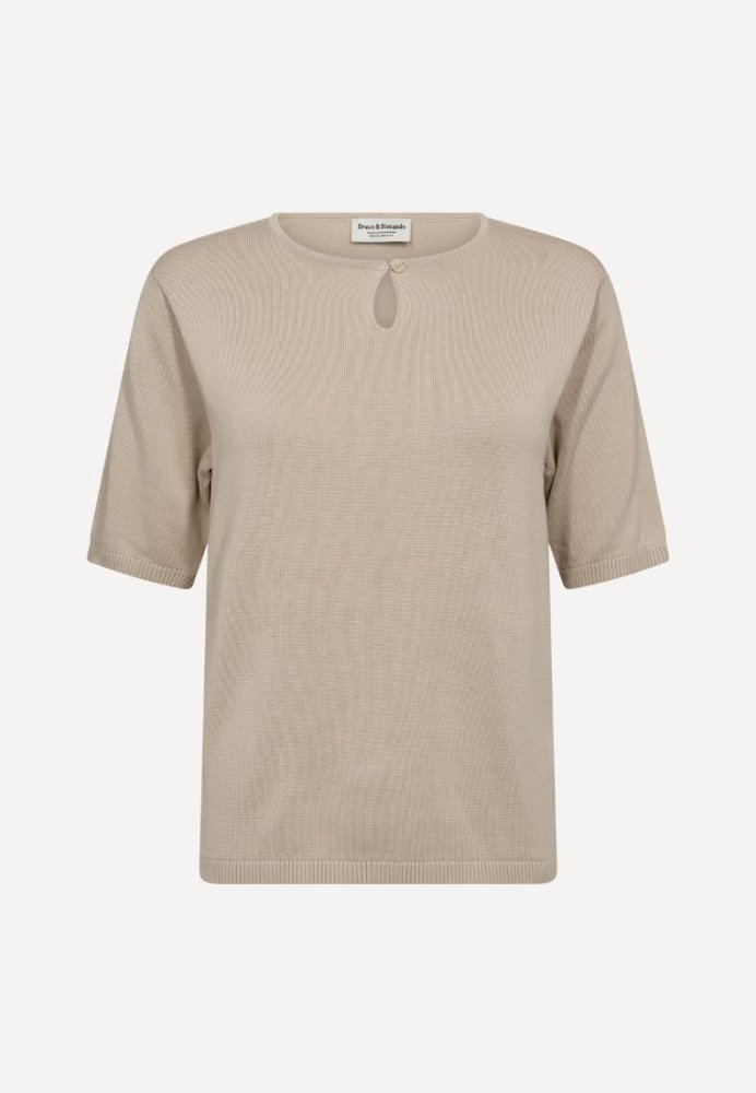 En blød og let strikket T-shirt fra Bruun & Stengade i en behagelig bomulds- og tencelblanding. Den fine åbning foran med lille knap giver et enkelt, feminint touch. En alsidig hverdagsfavorit.