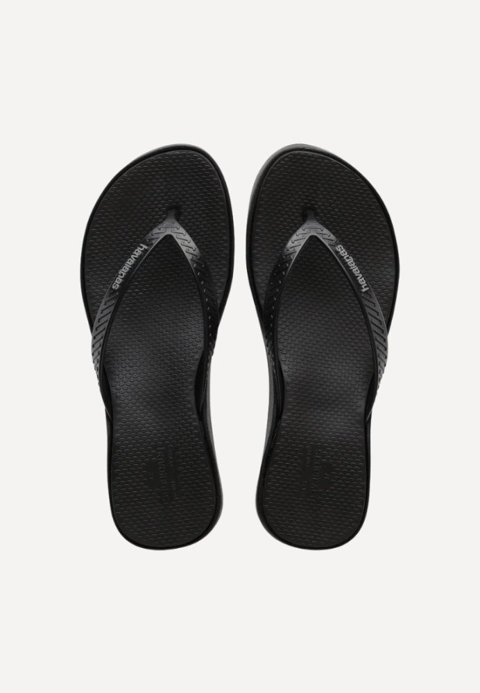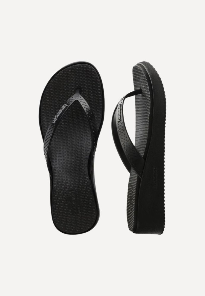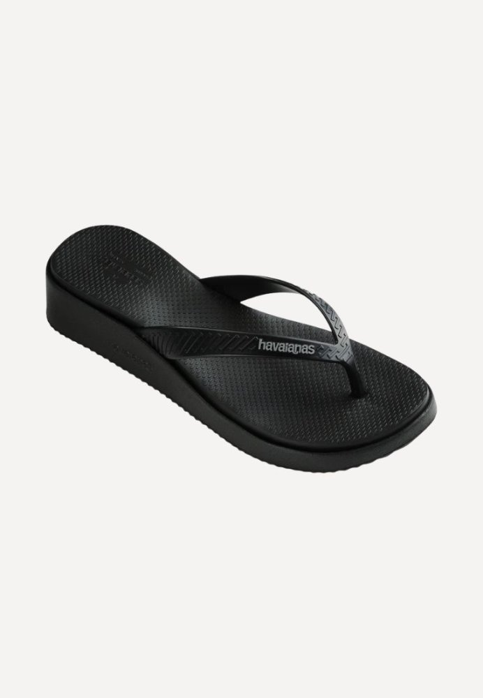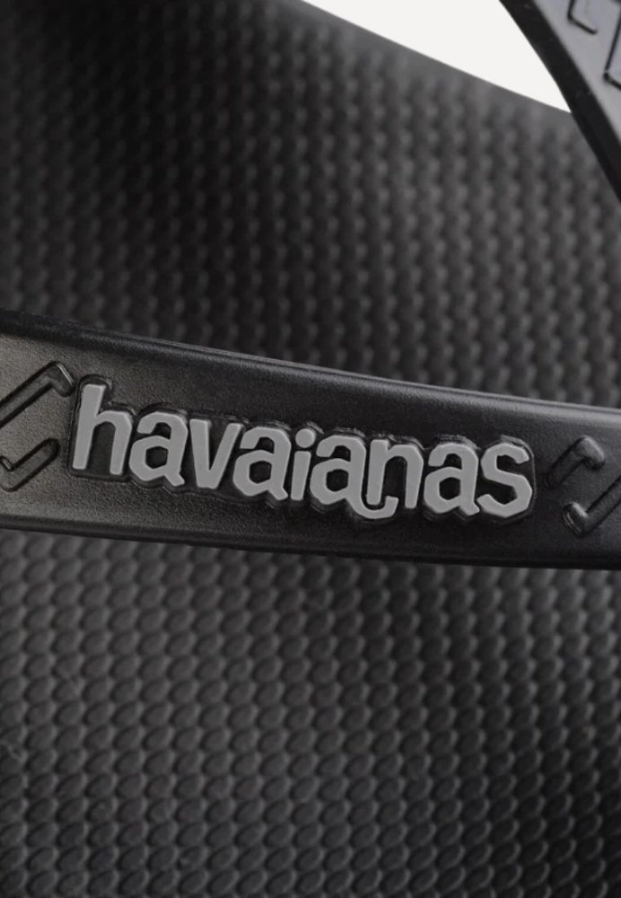 Klassiske sorte klipklapper fra Havaianas med fokus på både komfort og funktionalitet. Modellen har en let forhøjet sål med en smule hæl. Den strukturerede overflade bidrager til et sikkert fodfæste, mens de brede remme med et diskret logo tilfører et enkelt og stilrent udtryk. Et oplagt valg til både strand, ferie og afslappede sommerdage.