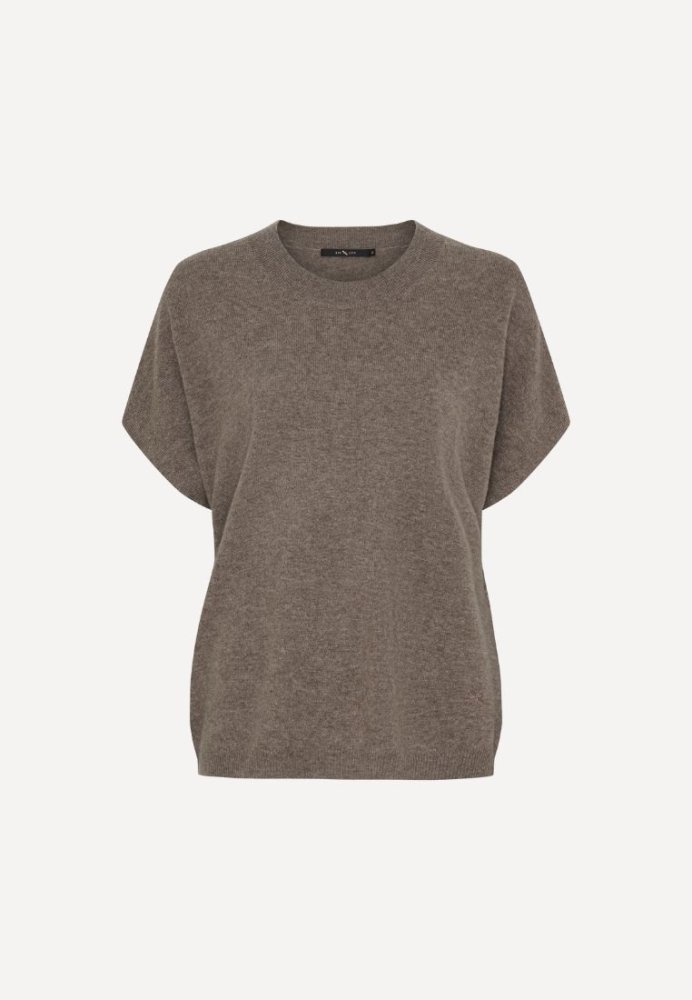 En luksuriøs fintstrikket bluse fremstillet i en eksklusiv blanding af cashmere og merinould. Blusen har et afslappet, oversized udtryk over brystet kombineret med en klassisk rund halsudskæring, korte ærmer og smalle ribkanter ved hals, ærmer og forneden. Materialet er let, temperaturregulerende og ekstremt blødt mod huden, hvilket gør den ideel både til kølige og lunere dage. Designet forener komfort og elegance i en tidløs silhuet, som nemt kan styles til både hverdag og mere sofistikerede looks.