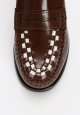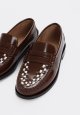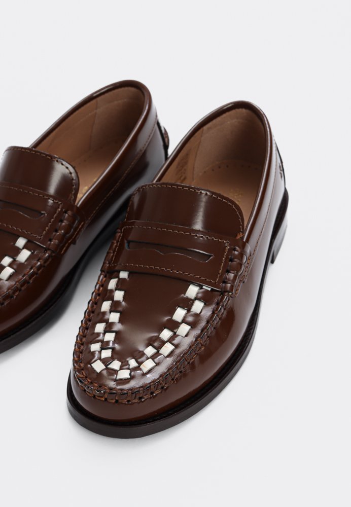 En elegant penny loafer i skind med et eksklusivt og moderne udtryk. Skoen er designet med kontrastfarvet, vævet skinddetalje på overdelen, som tilfører et raffineret twist til den klassiske loafer. Den lave gummisål giver et let og komfortabelt trin, mens den håndsyede mokkasinsyning understreger den høje kvalitet og det tidløse design. En stilfuld loafer, der nemt kan bruges til både hverdag og mere formelle outfits.