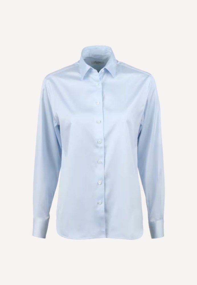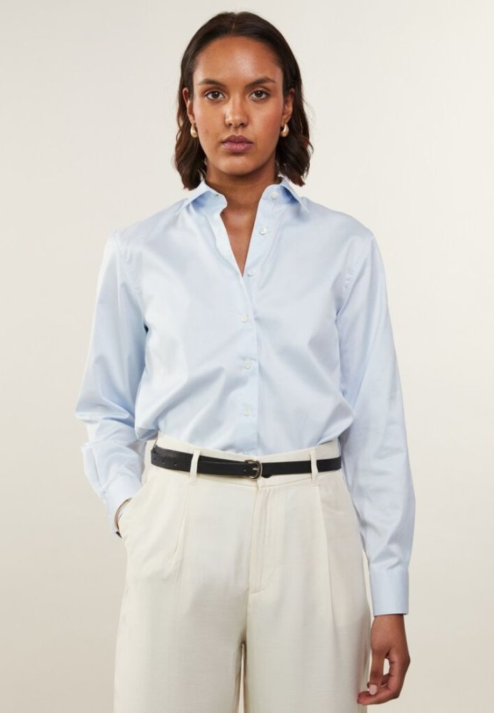 En klassisk lyseblå skjorte går aldrig af mode. Siri-skjorten er skåret i blød og let bomuldssatin med stretch, som giver en komfortabel pasform og et elegant fald. Den har enkel manchet, skjortekrave og luksuriøse perlemorsknapper. Brug den både til skræddersyede bukser for et sofistikeret look eller til casual denim for en afslappet stil.