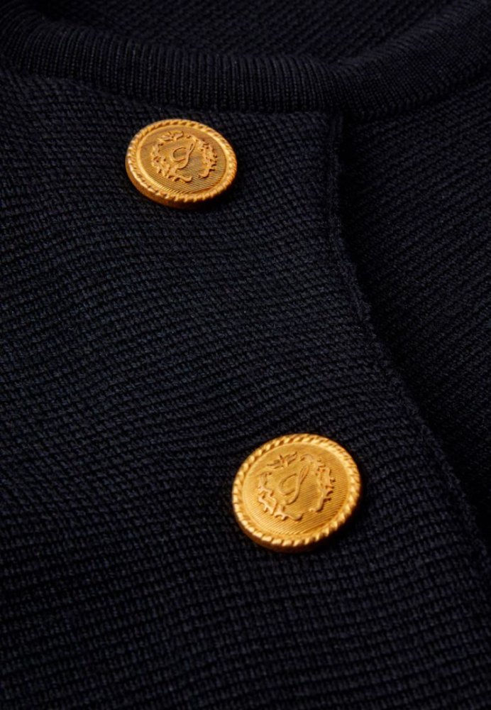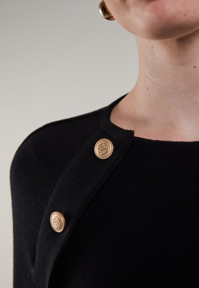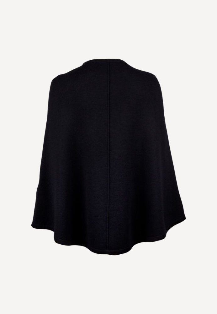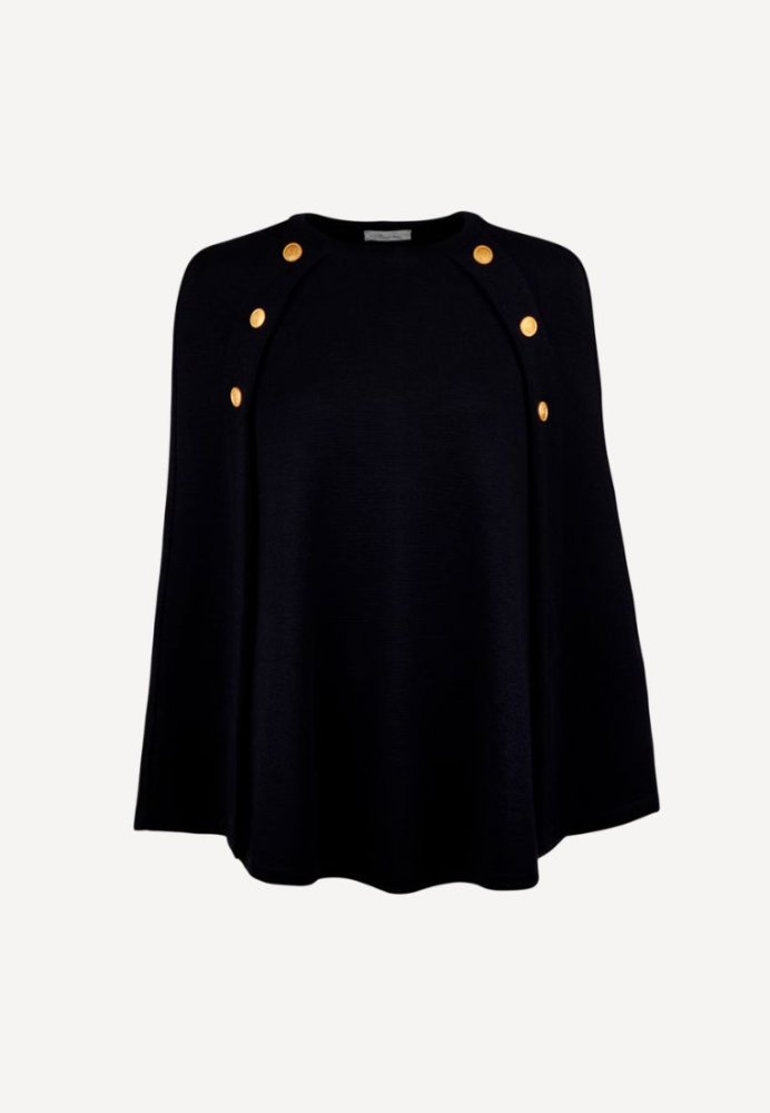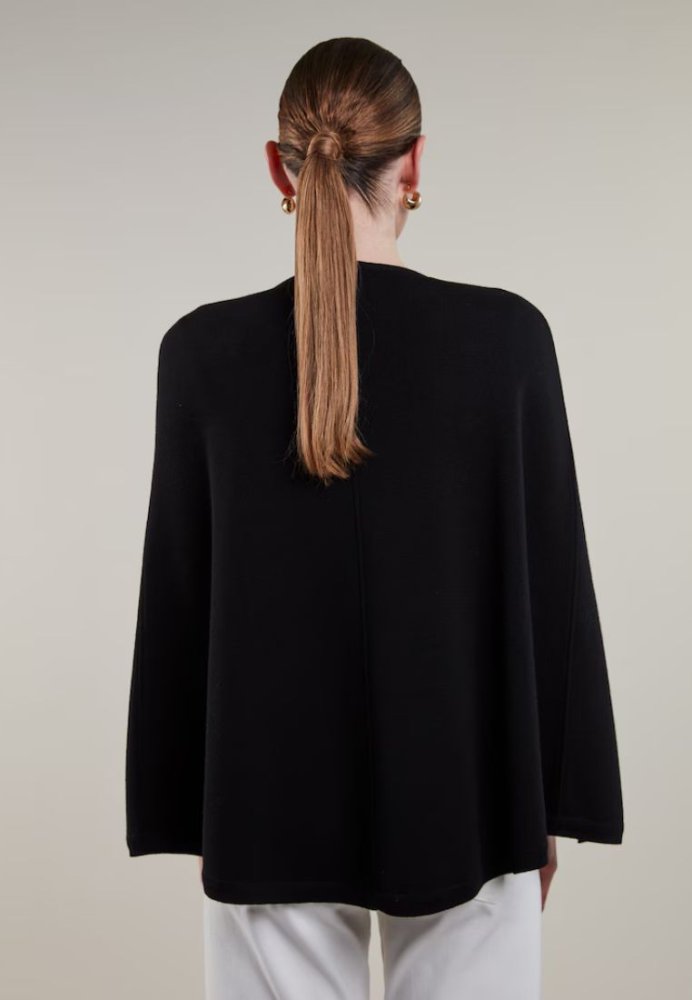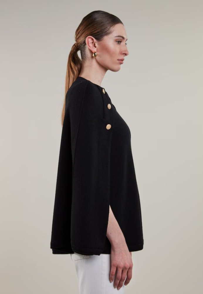Mary er en sort poncho i blød merino uld, der kombinerer afslappet komfort med elegante detaljer. De gyldne S-knapper på skuldrene og slidsene i siderne giver et stilfuldt og sofistikeret udtryk. Perfekt som et ekstra lag til både hverdag og fest.