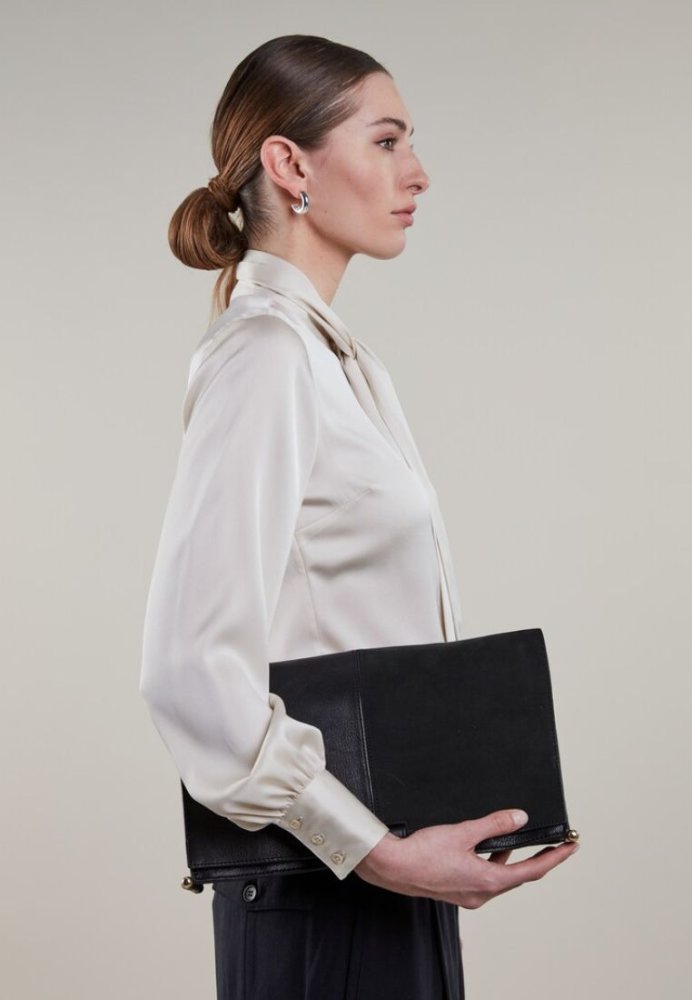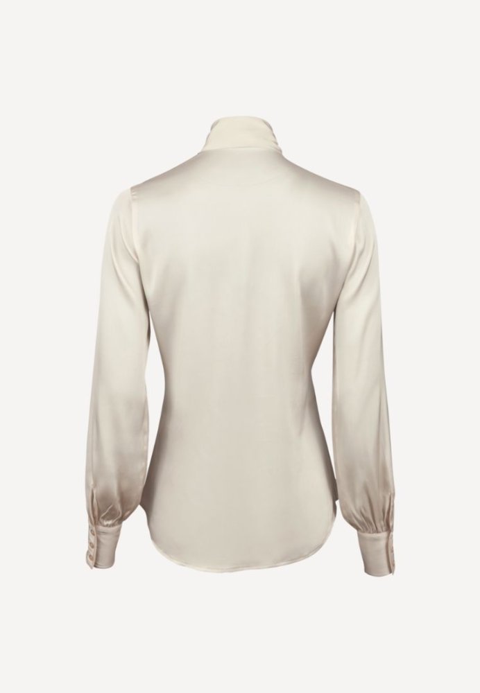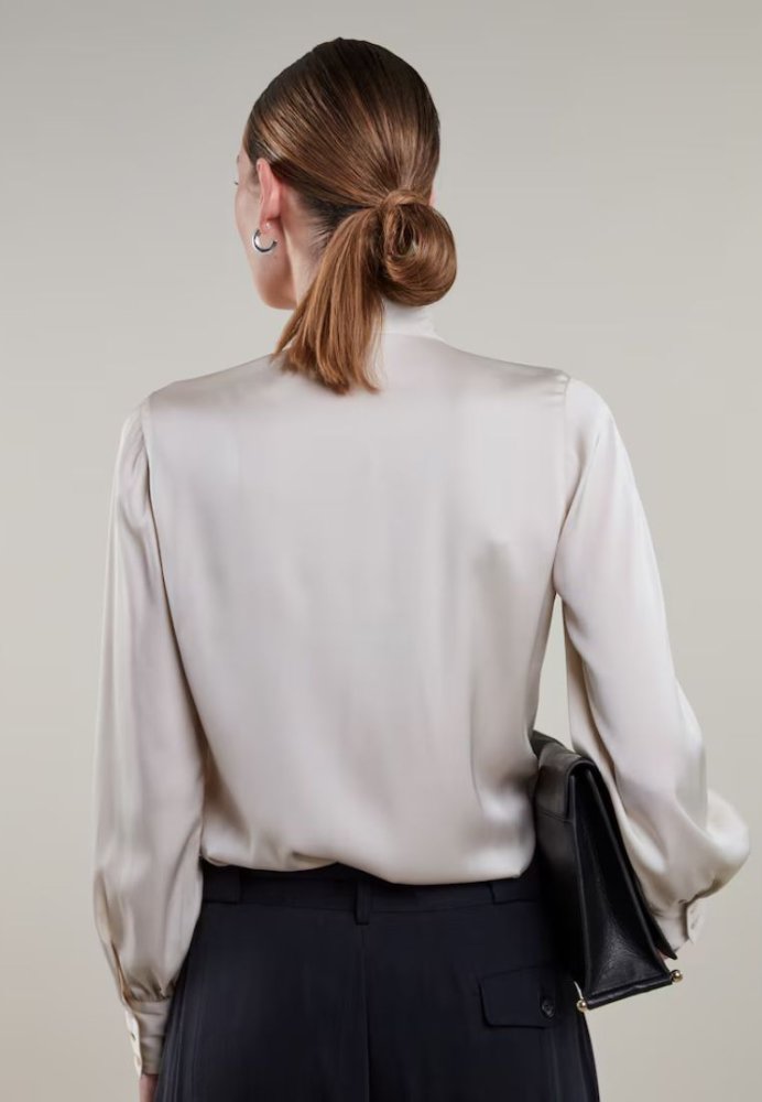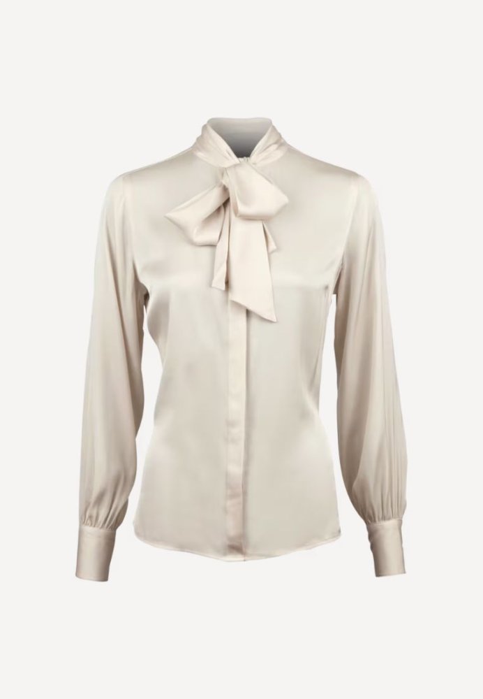 Selma Champagne Sløjfebluse er en elegant bluse i silke med feminin silhuet og klassiske detaljer. Designet har en sløjfe i halsen, perlemorsknapper, enkel manchet og skjult knaplukning, som tilfører et sofistikeret udtryk. Perfekt til både festlige lejligheder og kontoret.
