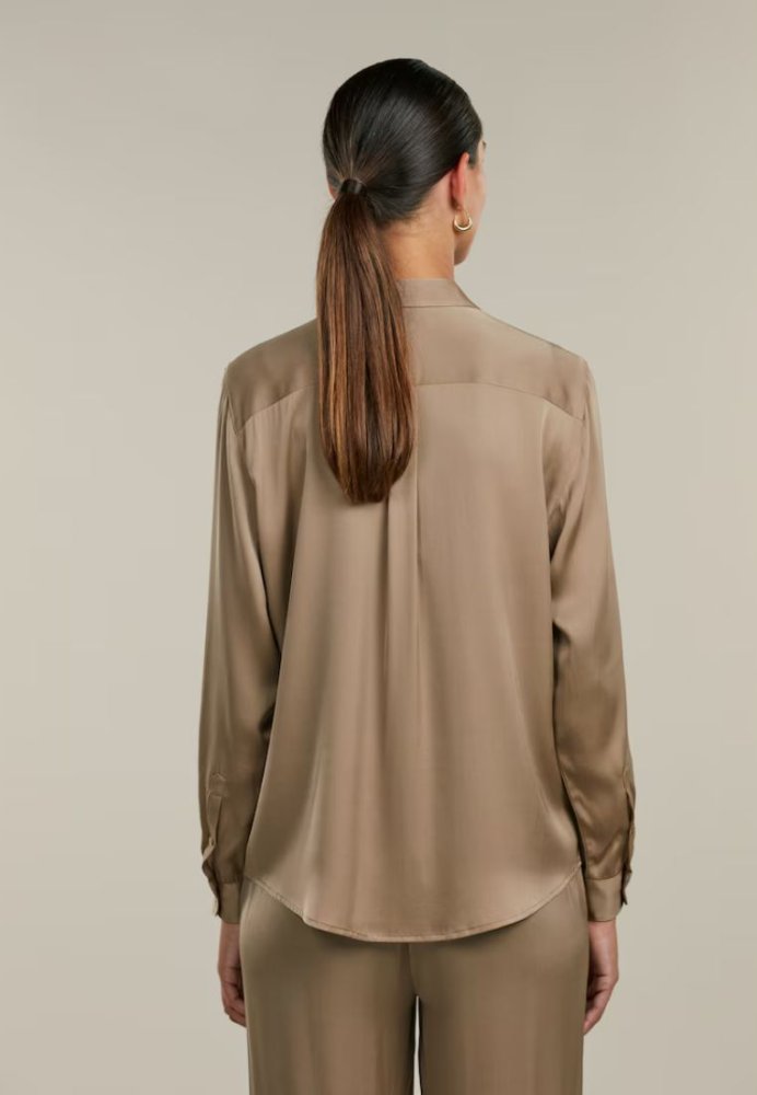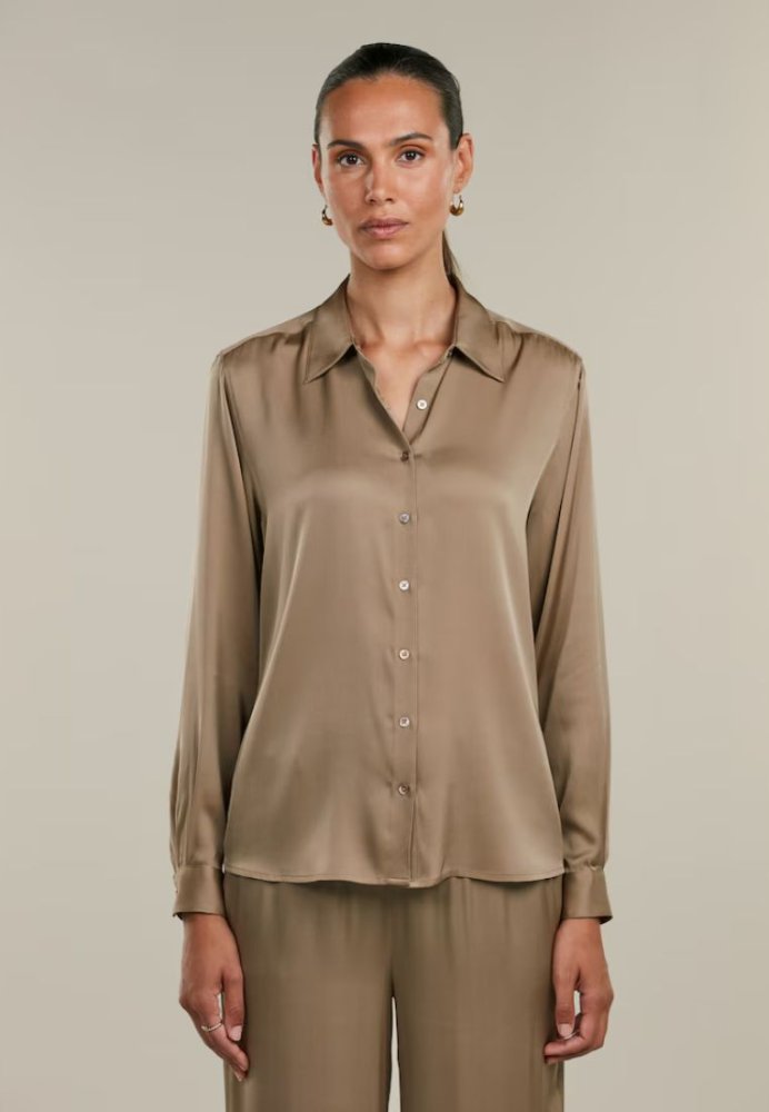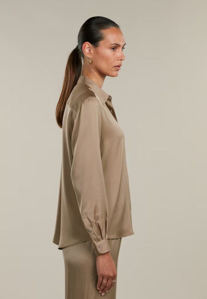 Kornelia Beige Silkeskjorte er en tidløs og elegant skjorte med klassisk skjortekrave, perlemorsknapper og enkel manchet. Skjorten er fremstillet i en luksuriøs blanding af silke, viskose og spandex, hvilket giver en let, blød og behagelig pasform. Den relaxed fit gør skjorten perfekt til både hverdag og mere formelle lejligheder.