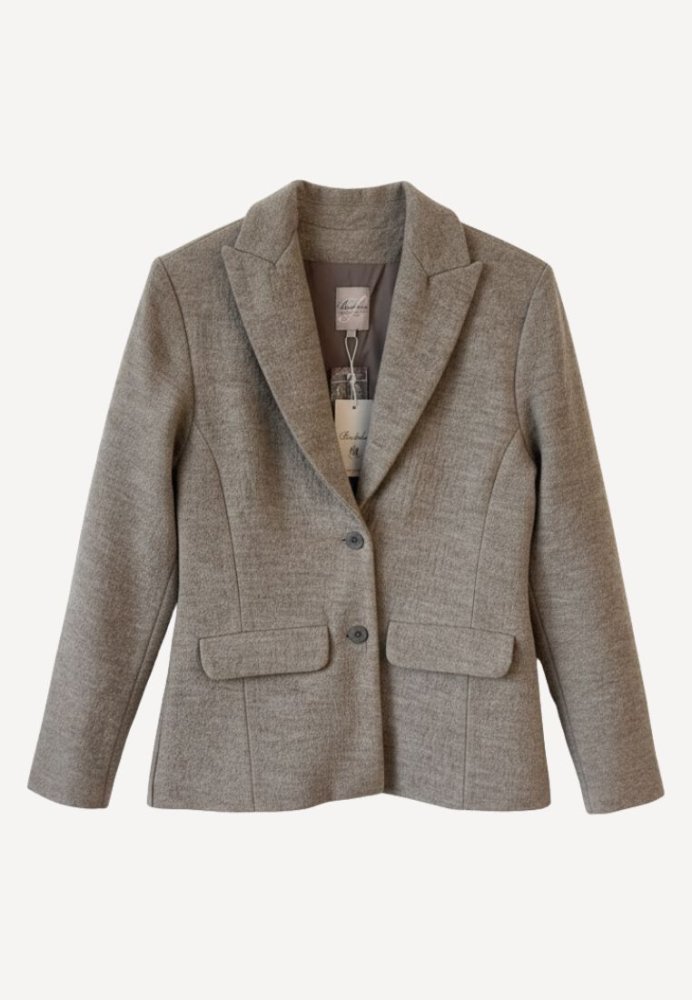 En flot og behagelig klassisk blazerjakke i lys brun melange – elegant og alligevel afslappet i sit udtryk. Jakken har klassisk revers, lommer med klapper og lukkes med to knapper. Den er fuldforet og tilpasset kroppen med faconsyninger i ryg og sider, hvilket giver en feminin pasform uden at gå på kompromis med komfort. Perfekt til både hverdag og mere formelle anledninger.