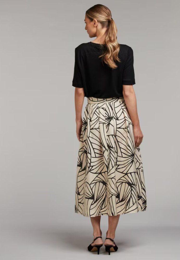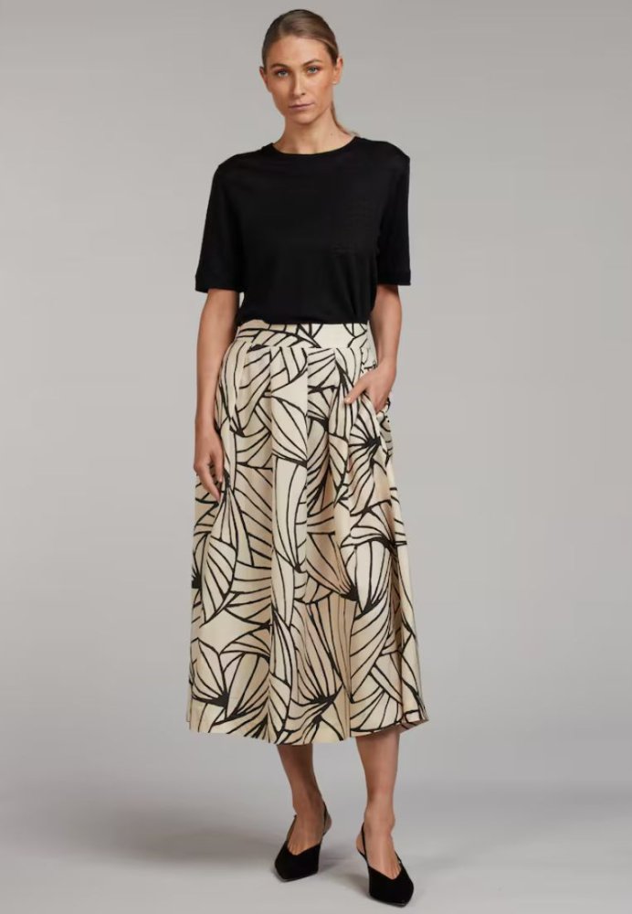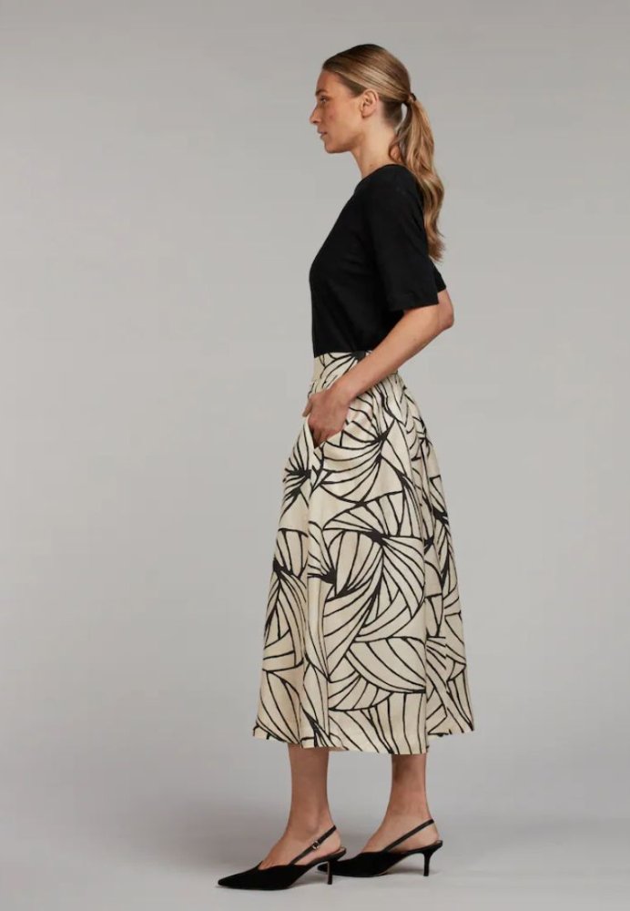 Smuk nederdel fra Stenströms med et elegant og iøjnefaldende mønster. Den lette kvalitet og det fine fald giver et feminint udtryk, mens den flatterende pasform fremhæver taljen på en elegant måde. Perfekt til både hverdagsbrug og særlige lejligheder, hvor den kan styles med en enkel top eller skjorte for et stilfuldt look.