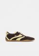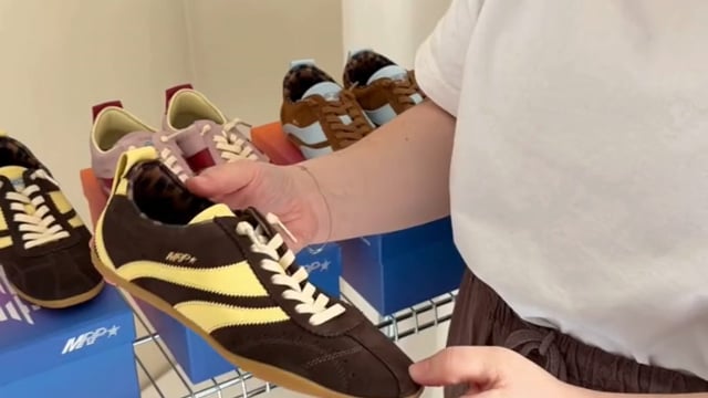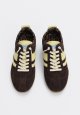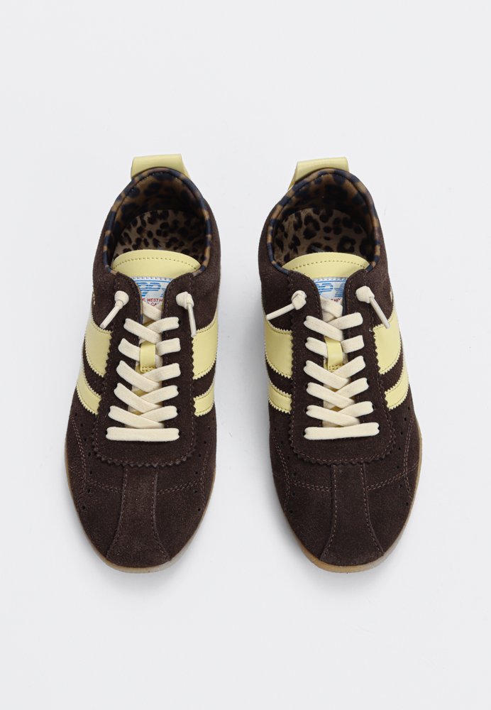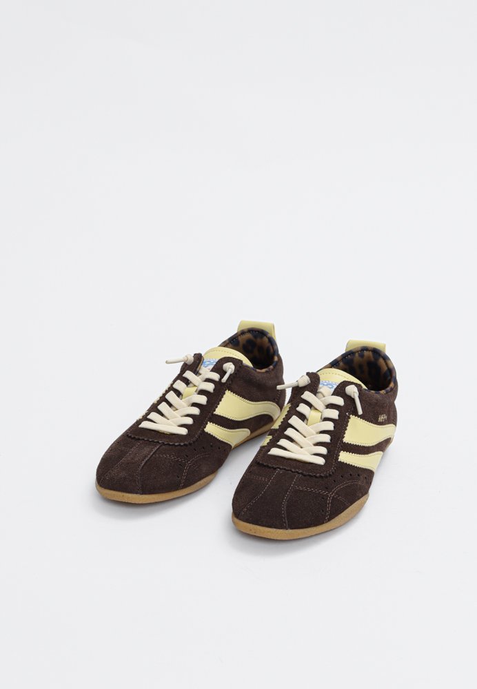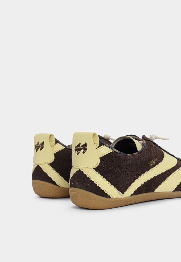 Runaway V9 sneaker fra Maripé er en eksklusiv italiensk sneaker, hvor moderne design møder klassisk håndværk. Modellen er fremstillet i en luksuriøs kombination af ruskind og læder, som giver skoen et raffineret og dynamisk udtryk. De varme brune nuancer kombineret med gule detaljer skaber et stilfuldt og karakterfuldt look.