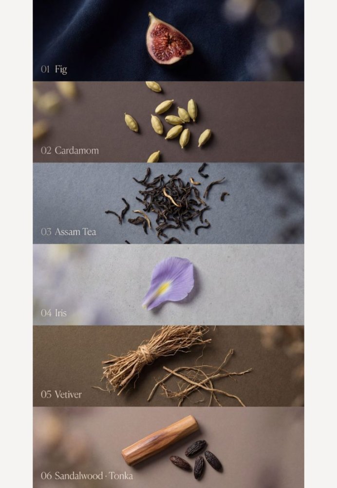 Indigo folder sig ud som skumring på huden – blød, afdæmpet og dragende på en underspillet måde. Saftig figen åbner duften med en mørk og elegant dybde, ledsaget af krydret kardemomme og nuancer af sort te, der tilfører ro og balance. Efterhånden træder pudrede irisnoter frem og smelter sammen med cremet sandeltræ og jordnær vetiver, som giver en varm og harmonisk afslutning. Resultatet er en sofistikeret duft med en stille intensitet – en duft, der udvikler sig langsomt og efterlader et vedvarende, elegant aftryk.